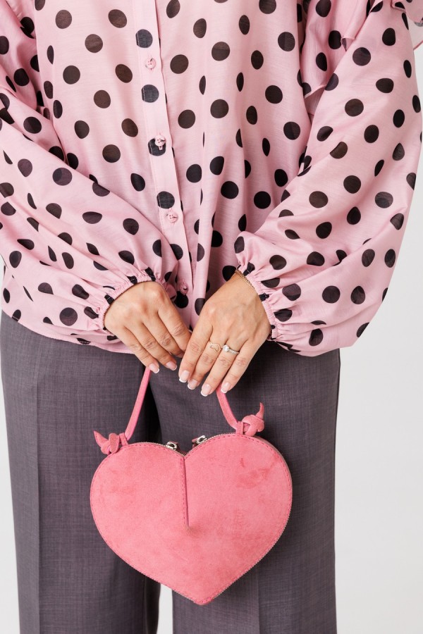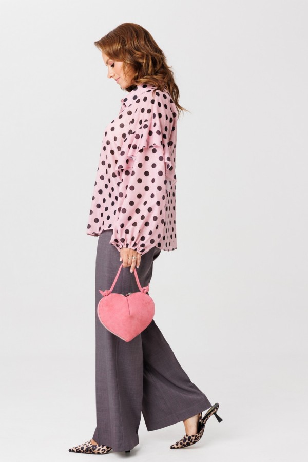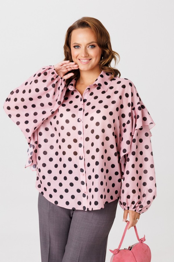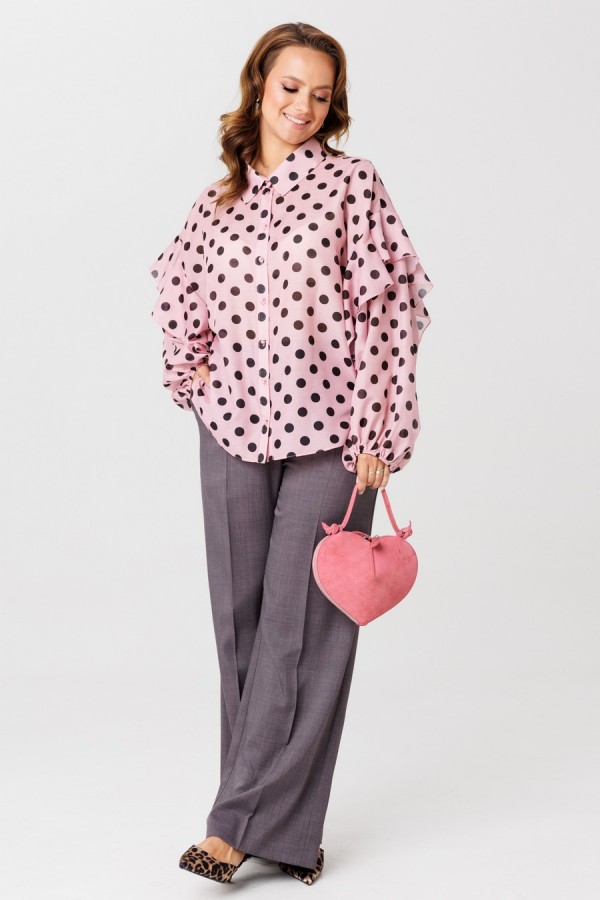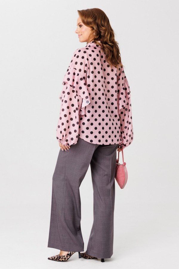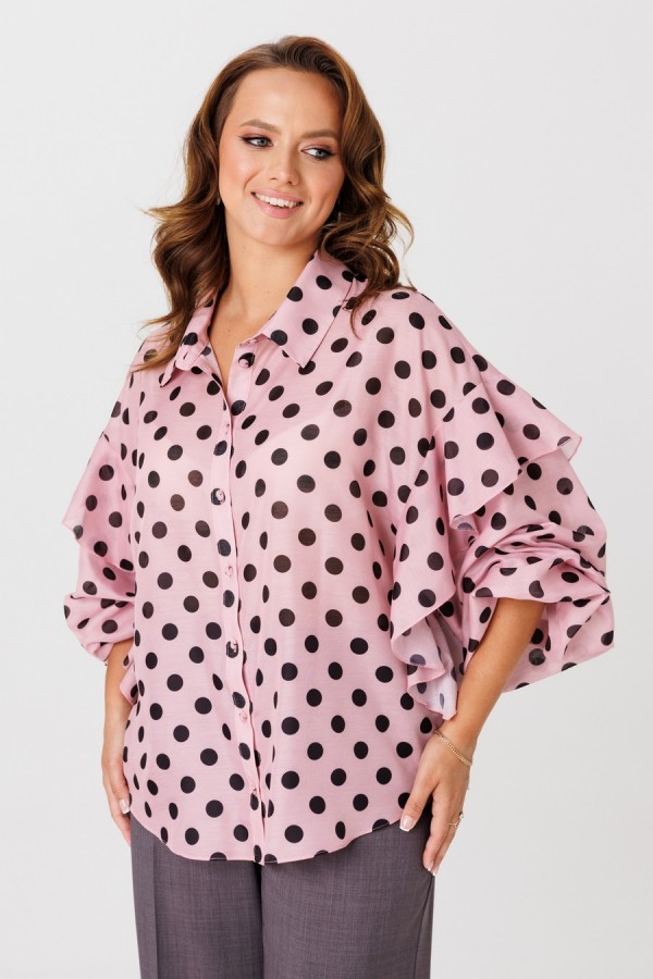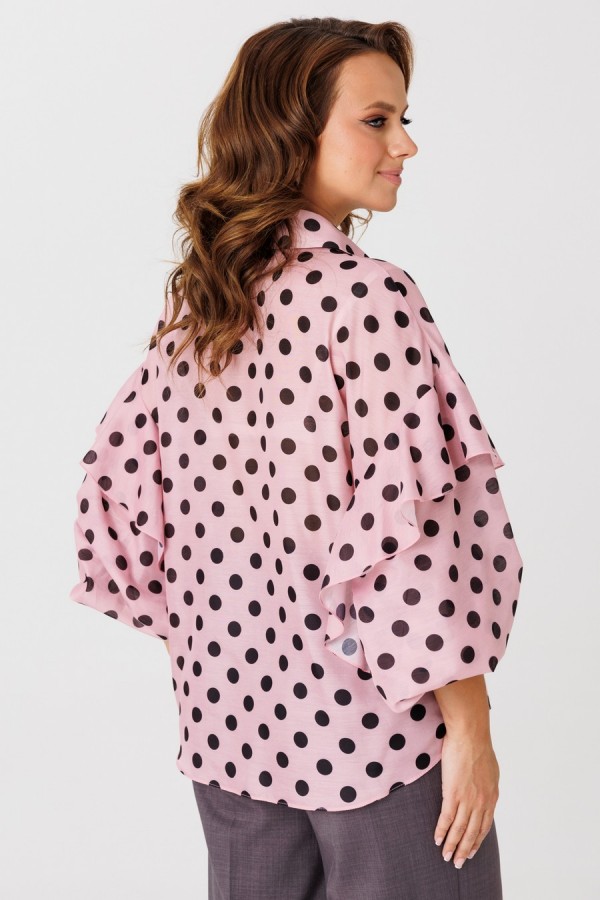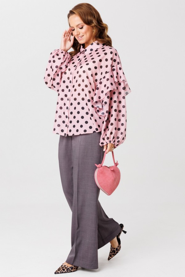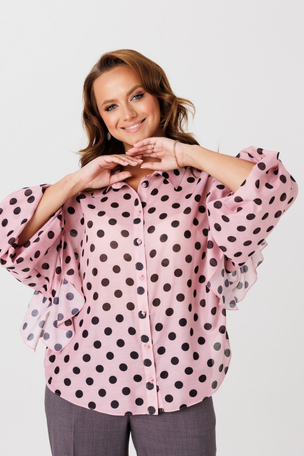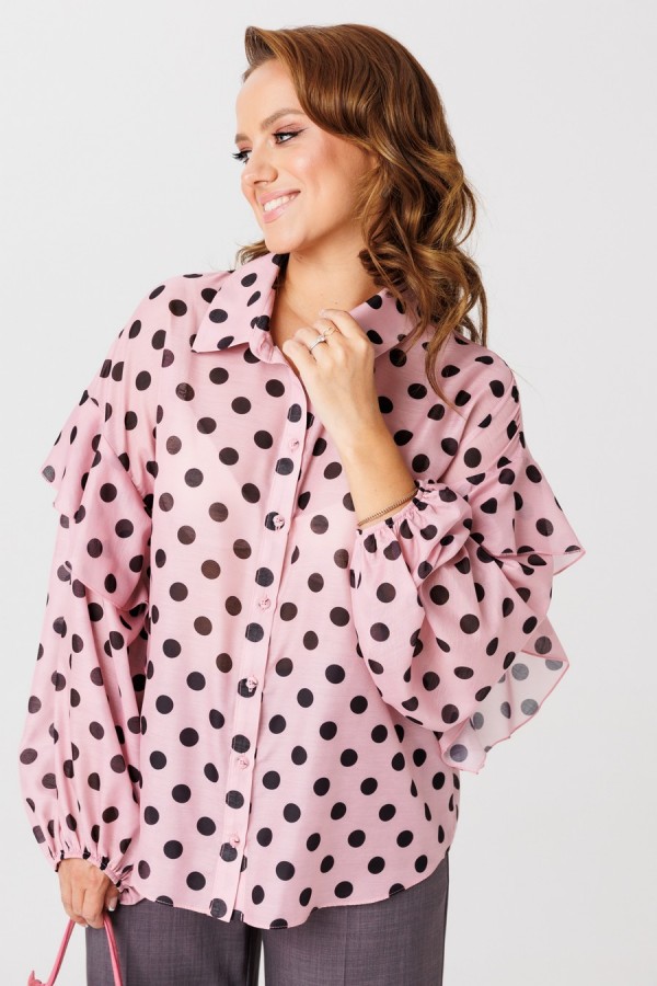 Блузка свободного силуэта изготовлена из вискозной ткани в принт «Горошек». Спущенная линия плеча, рукав широкий втачной, низ рукава собран на резинку. По линии втачивания рукава притачен декоративный волан. По горловине отложной воротник на отрезной стойке. Полочка с центральной застежкой на петли-пуговицы, на притачной планке.