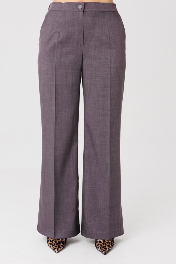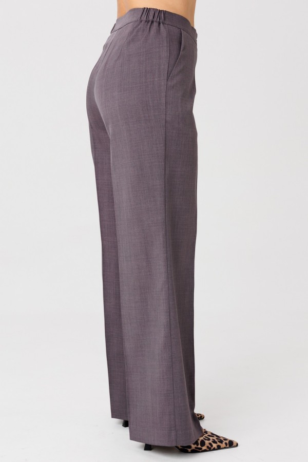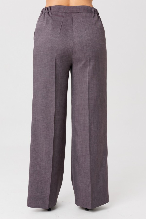 Брюки свободного кроя с высокой посадкой. В боковых швах функциональные карманы. Верхний срез обработан притачным поясом, который с резинкой по боковым швам. Застежка в брюках на тесьму-молнию.