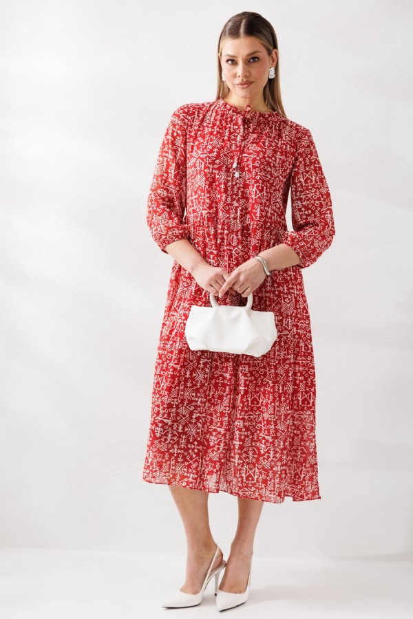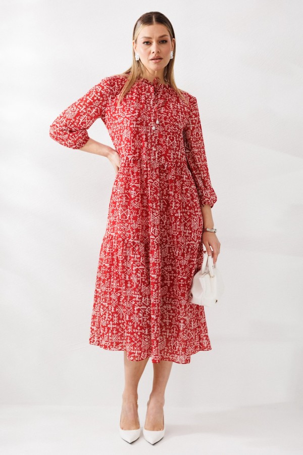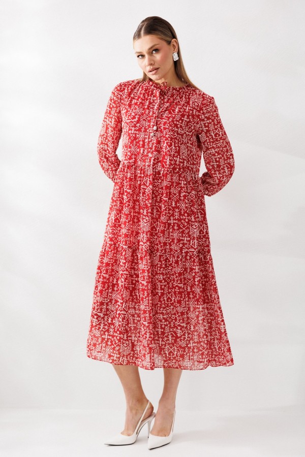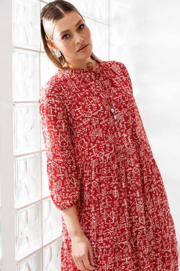 Платье отрезное чуть выше линии талии. Верхняя часть переда с V-образным вырезом и цельнокроеными планками. Горловина оформлена рюшей, присборенной резинкой. Горловина с завязками. По нижней части платья два ряда присборенных воланов. Рукава втачные, одношовные по низу присборены резинкой.