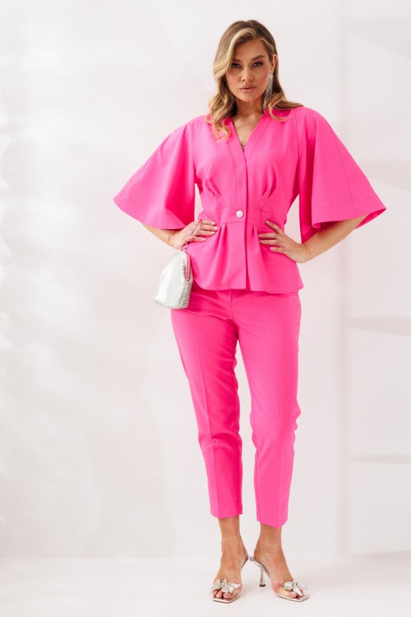 Жакет полуприлегающего силуэта с отрезным поясом и баской. По лифу переда и баскам односторонние складки. По лифу спинки талиевые вытачки. Горловина оформлена V-образным вырезом с отрезными планками. Застежка центральная на пришивные кнопки и отделочную пуговицу по поясу. Рукава покроя «реглан» расширенные к низу. Жакет без подкладки.
