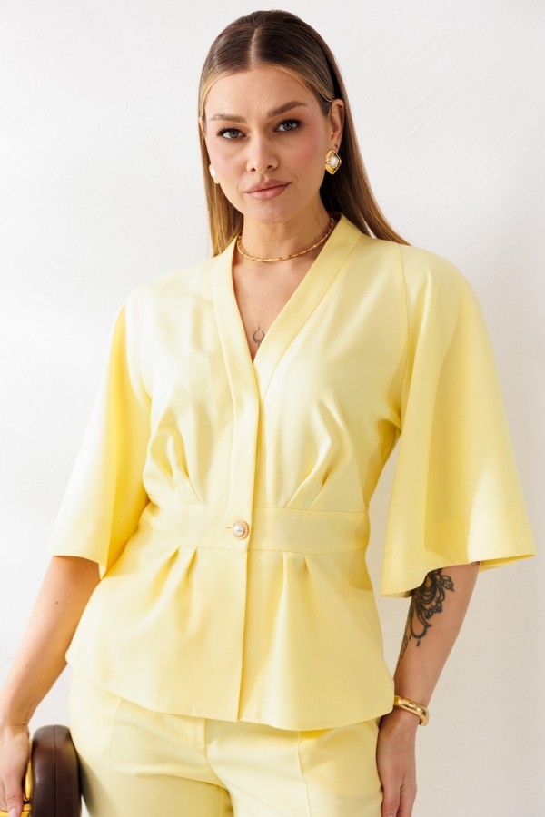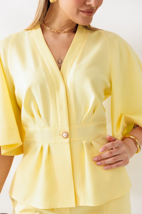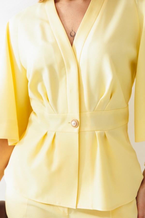 Жакет полуприлегающего силуэта с отрезным поясом и баской. По лифу переда и баскам односторонние складки. По лифу спинки талиевые вытачки. Горловина оформлена V-образным вырезом с отрезными планками. Застежка центральная на пришивные кнопки и отделочную пуговицу по поясу. Рукава покроя «реглан» расширенные к низу. Жакет без подкладки.