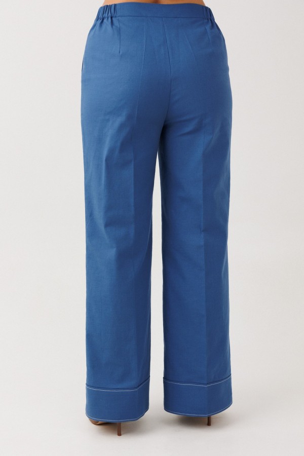 Брюки прямого, свободного кроя с высокой посадкой, с наклонными карманами в боковых швах. По срезу банта застежка-молния. По передним половинкам вертикальная застроченная складка по 0,5см. По низу брюк отрезные манжеты. Верхний срез оформлен поясом с резинкой по задней половинке.