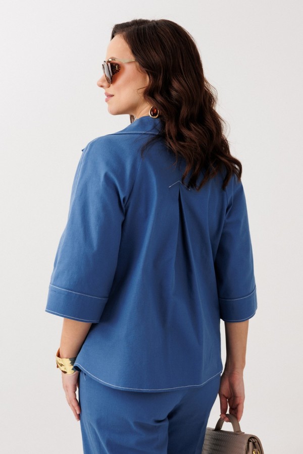 Жакет прямого силуэта без подкладки. По переду нагрудные вытачки, накладные карманы, центральная застежка на петли-пуговицы. По спинке встречная складка, застроченная до уровня лопаток. Горловина оформлена воротником пиджачного типа с лацканом. Рукава покроя реглан с притачными манжетами.