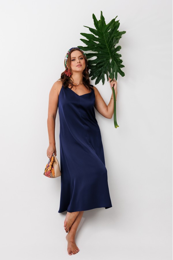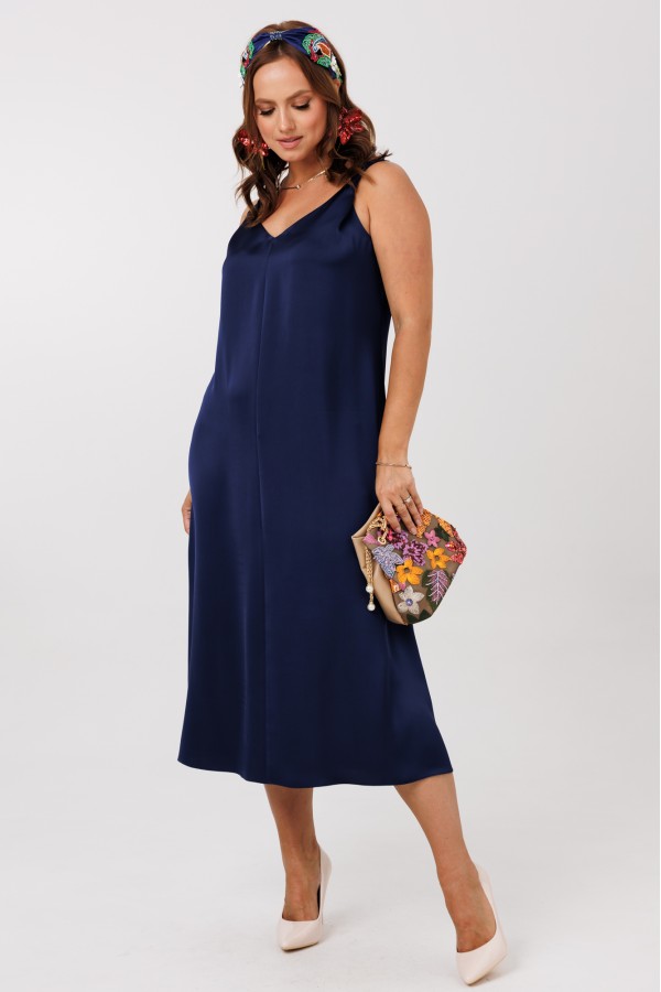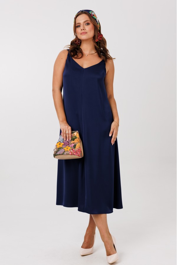 Платье А-силуэта без рукавов, выполненное из струящего шелка «Армани» (тянется). По переду и спинке центральные вертикальные швы. Горловина оформлена V-образным вырезом с акцентом на верхней части – декоративным перекрутом в области бретелей. Мягкая драпировка добавляет образу мягкости, романтичности и элегантности. Верхняя часть лифа на обтачке до линии талии.