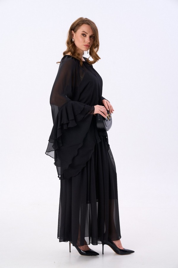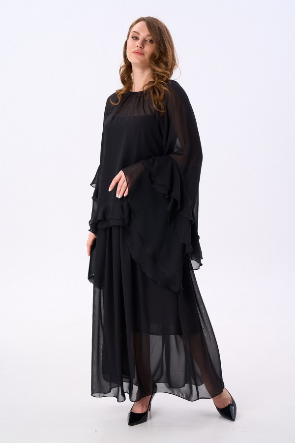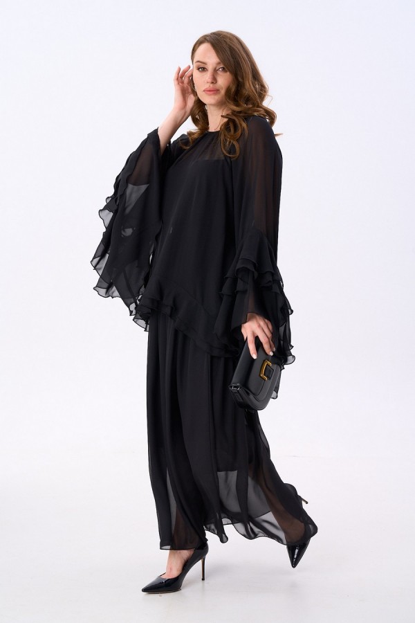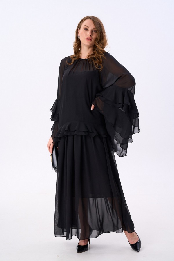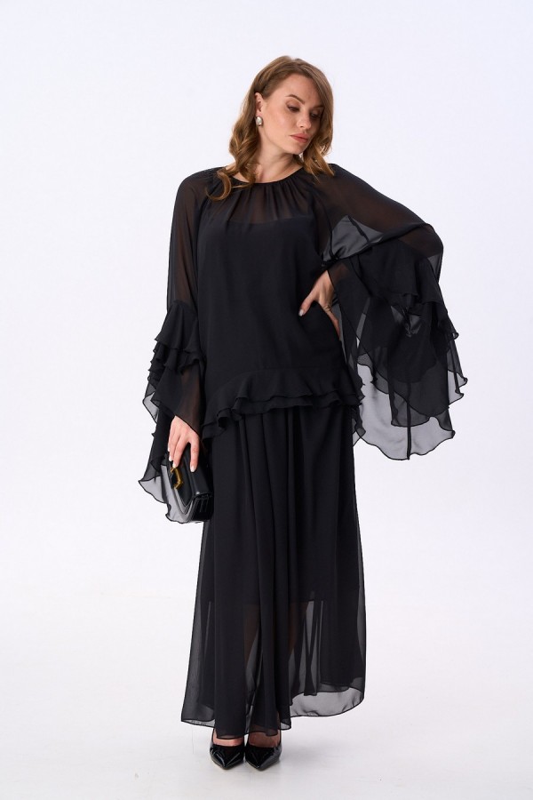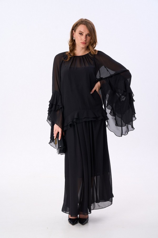 Костюм трехпредметный: состоит из блузы, юбки и комбинации. Блуза свободного силуэта с присборенной горловиной, обработанной бейкой. Спинка со средним швом, переходящим в разрез. Рукава реглан с асимметричными воланами. Юбка макси расширенного силуэта на резинке. Нижний край блузы с двойным воланом. Нижнее платье комбинация на регулируемых бретелях.