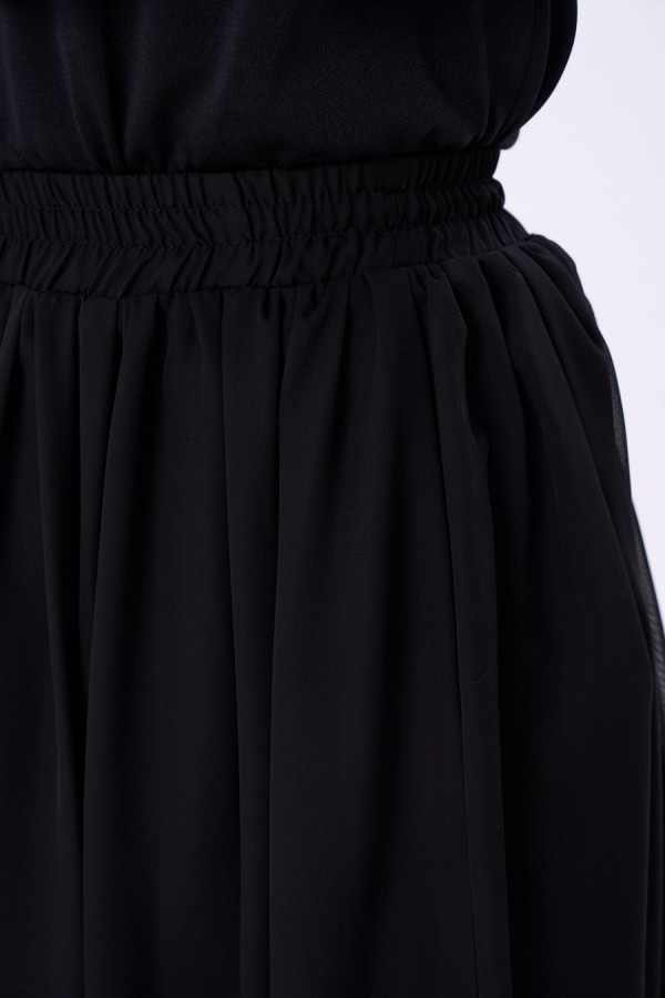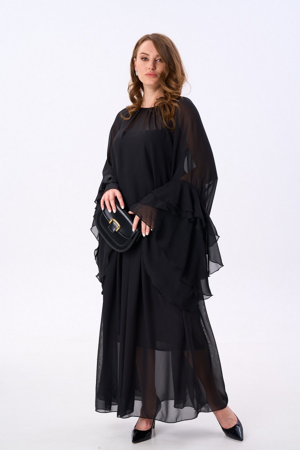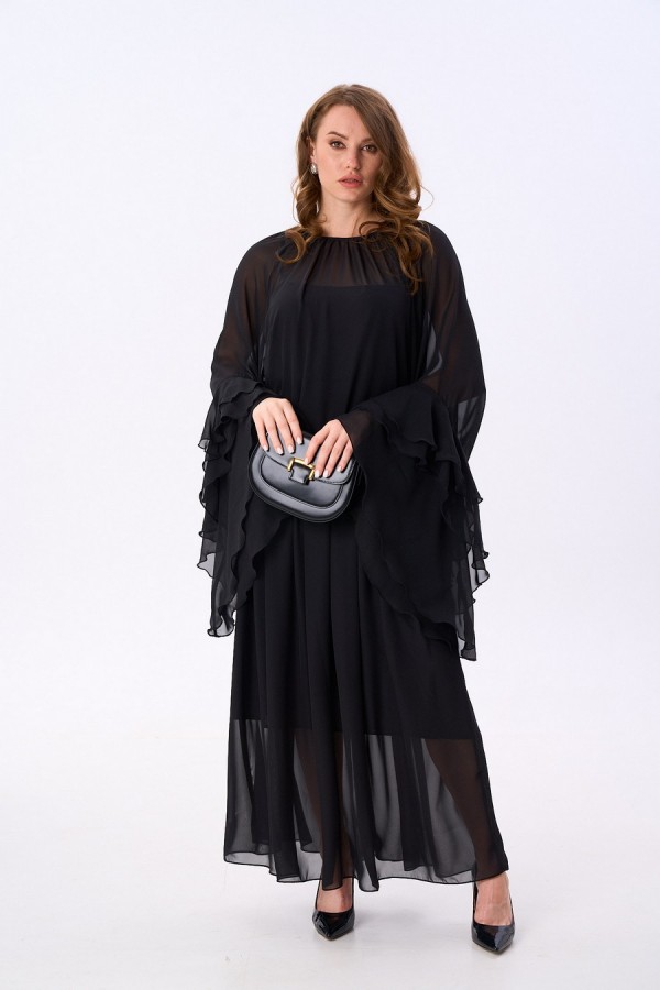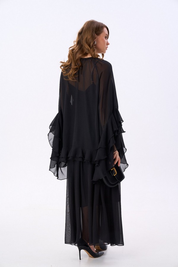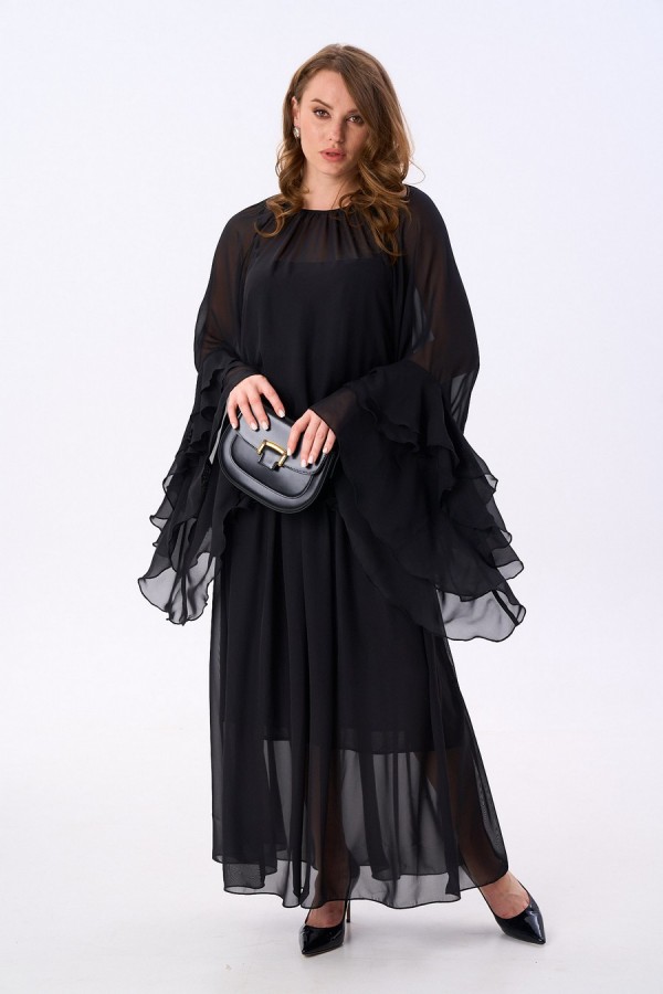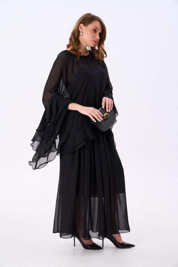 Костюм трехпредметный: состоит из блузы, юбки и комбинации. Блуза свободного силуэта с присборенной горловиной, обработанной бейкой. Спинка со средним швом, переходящим в разрез. Рукава реглан с асимметричными воланами. Юбка макси расширенного силуэта на резинке. Нижний край блузы с двойным воланом. Нижнее платье комбинация на регулируемых бретелях.