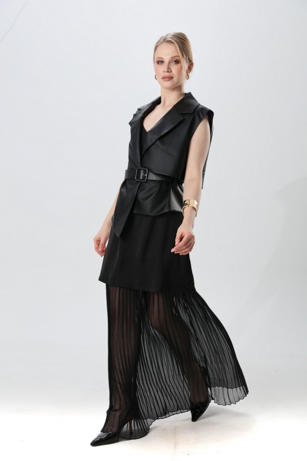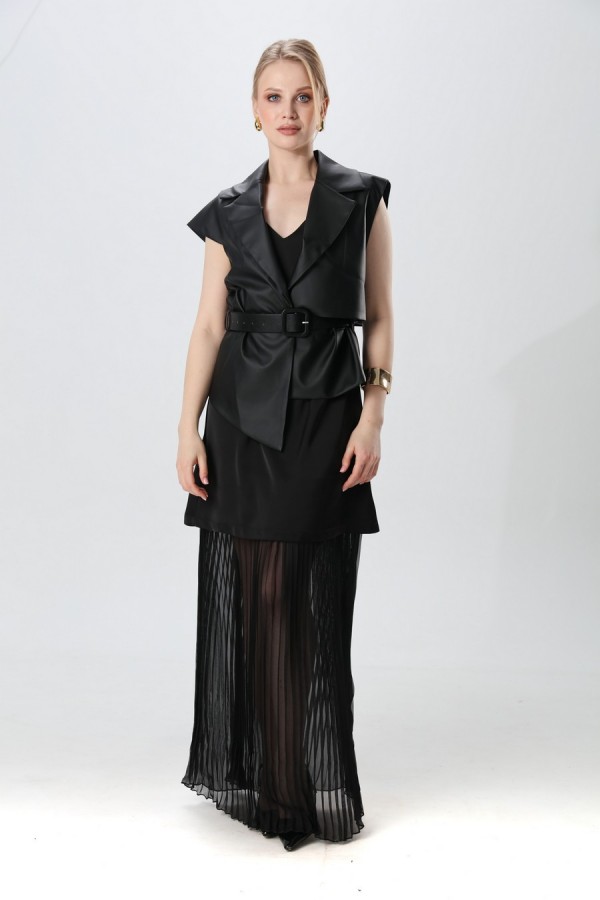 Костюм двухпредметный: состоит из платья и жилета. Платье прямого силуэта, с небольшим расширением к низу, длиной макси. Перед с нагрудной вытачкой из бокового шва. Вырез горловины переда и спинки имеют V-образную форму. Низ платья декорирован воланом из гофрированного шифона. Жилет из экокожи прямого силуэта с воротником пиджачного типа. По правой пройме переда расположена фигурная деталь "крылышко". Спинка со средним швом. По низу правого переда и низу правой спинки фигурная деталь. По левой части переда и левой части спинки отлетная кокетка. Изделие идёт в комплекте с ремнем из экокожи.