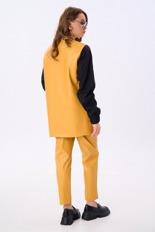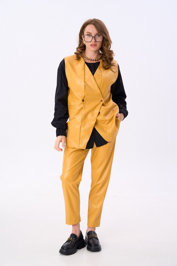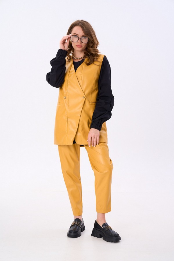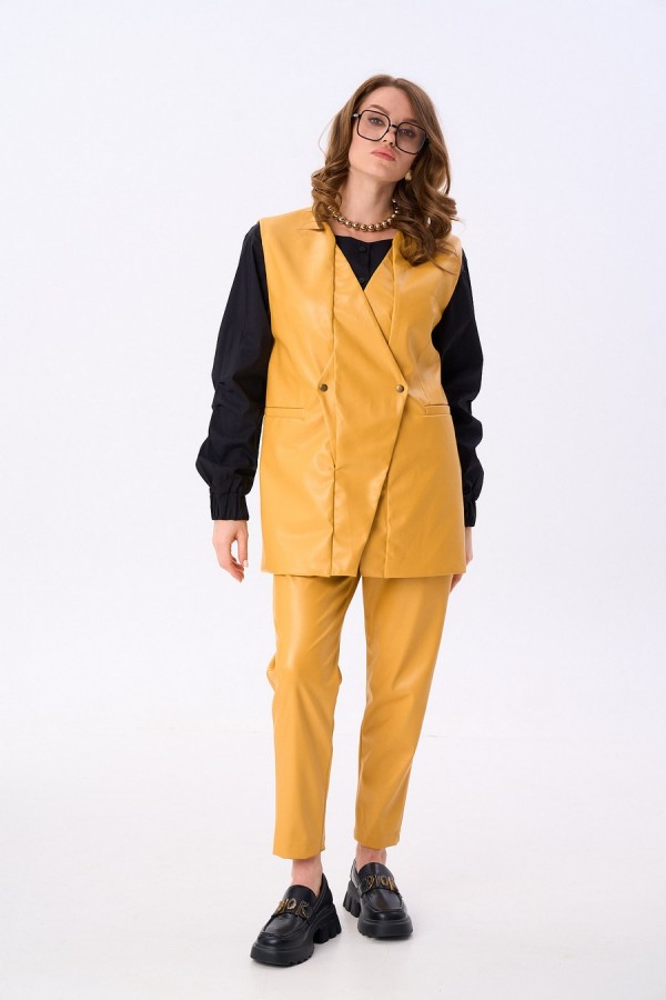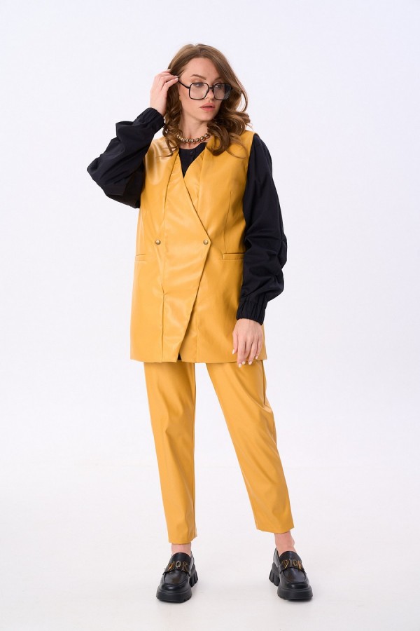 Костюм двухпредметный: состоит из жилета, брюк. Жилет двубортный прямого кроя объёма оверсайз. Застёжка фигурная на кнопки. Карманы - листочки. Брюки с притачным поясом и с карманами в боковых швах.