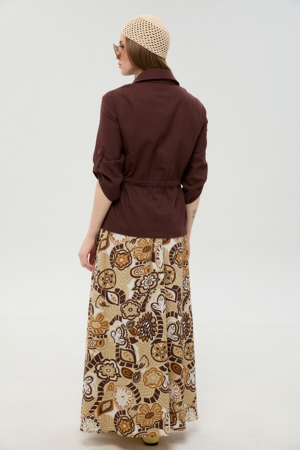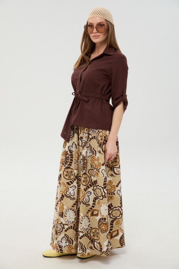 Костюм двухпредметный: состоит из жакета и юбки. Жакет прямого силуэта, воротник пиджачного типа, рукав одношовный, втачной с незначительно спущенной линией плеча, длиной три четверти, с патой. По линии ткани настрачная кулиса с завязками из основной ткани. Застежка центрально-бортовая. Линия низа верхней части фигурная ассиметричная. Юбка - солнце макси с узким поясом на резинке.
