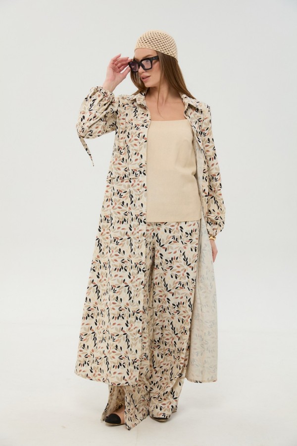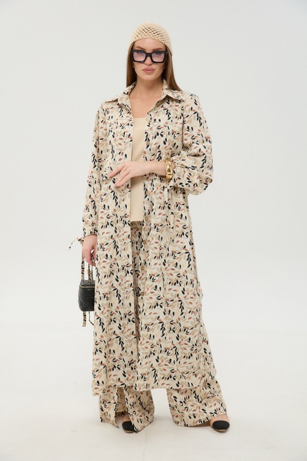 Костюм трехпредметный: состоит из кардигана-платья, брюк и топа. Платье-кардиган макси с центральной отрезной застёжкой на потайную планку на петли и пуговицы. По переду и спинке цельнокроеные складки на уровне талии. Рукав втачной, одношовный рубашечного типа. По низу рукава пробиты петли и вставлена завязка для фиксации сборки . Воротник рубашечный стояче отложной. В комплект к изделию идёт пояс из основной ткани для максимально комфортного регулирования объёма. Брюки свободного кроя, верхний срез представлен широкой резинкой, с карманами. По центру правой брючины расположена планка с функционирующими петлями и пуговицами. Топ на тонких регулируемых бретелях.