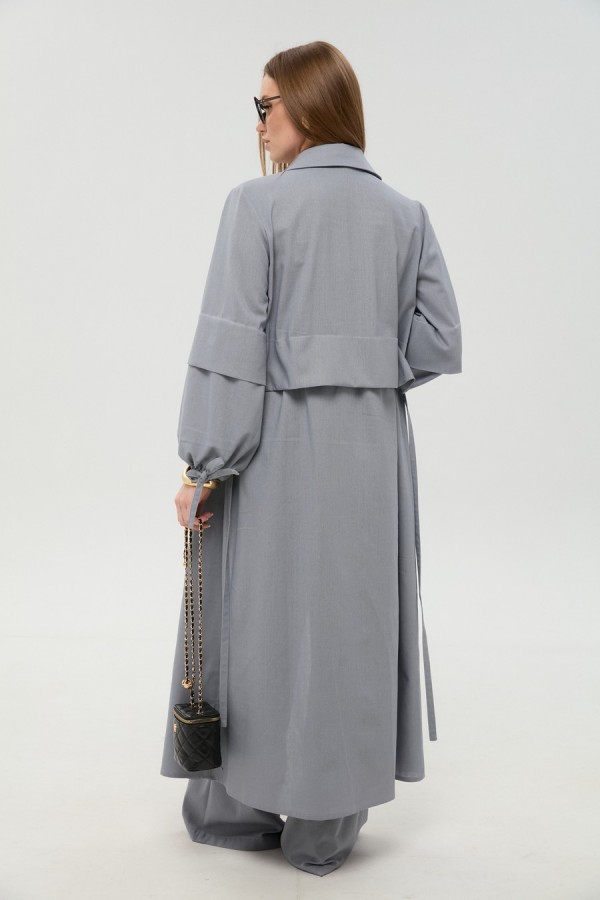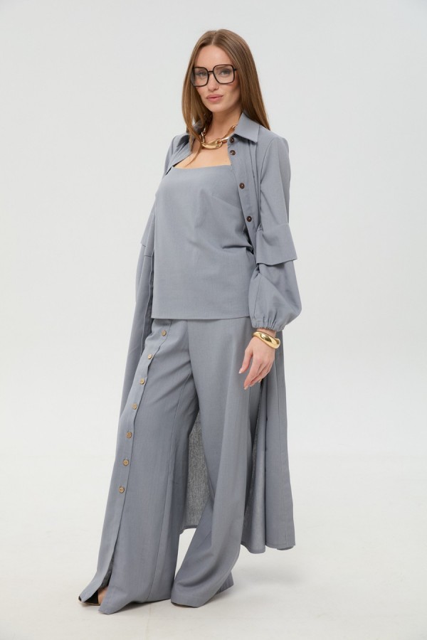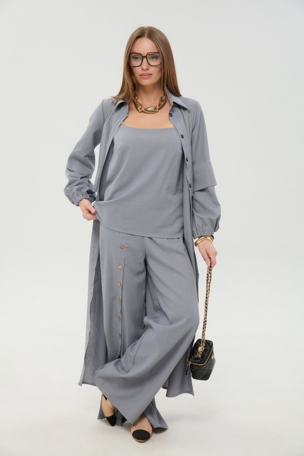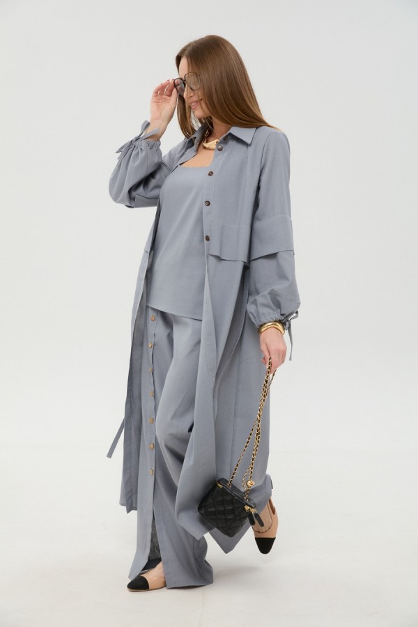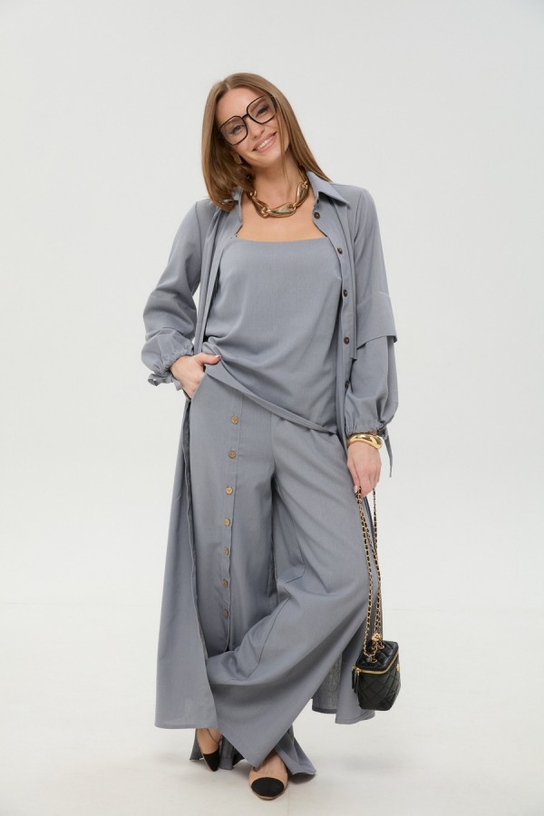 Костюм трехпредметный: состоит из кардигана-платья, брюк и топа. Платье-кардиган макси с центральной отрезной застёжкой на потайную планку на петли и пуговицы. По переду и спинке цельнокроеные складки на уровне талии. Рукав втачной, одношовный рубашечного типа. По низу рукава пробиты петли и вставлена завязка для фиксации сборки . Воротник рубашечный стояче отложной. В комплект к изделию идёт пояс из основной ткани для максимально комфортного регулирования объёма. Брюки свободного кроя, верхний срез представлен широкой резинкой, с карманами. По центру правой брючины расположена планка с функционирующими петлями и пуговицами. Топ на тонких регулируемых бретелях.
