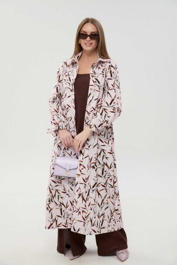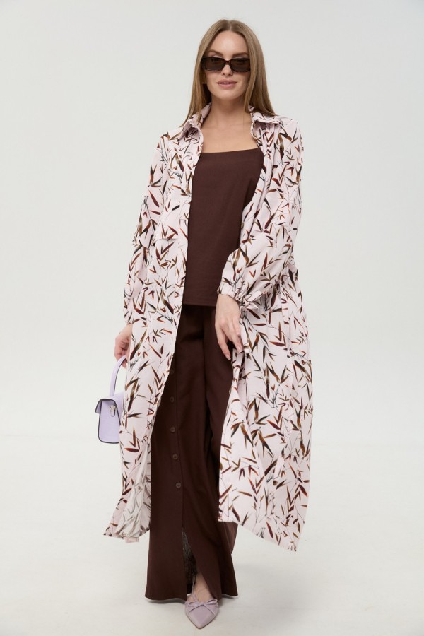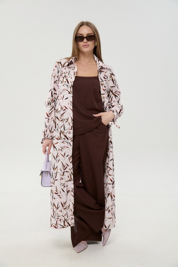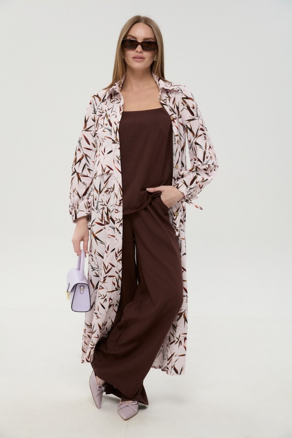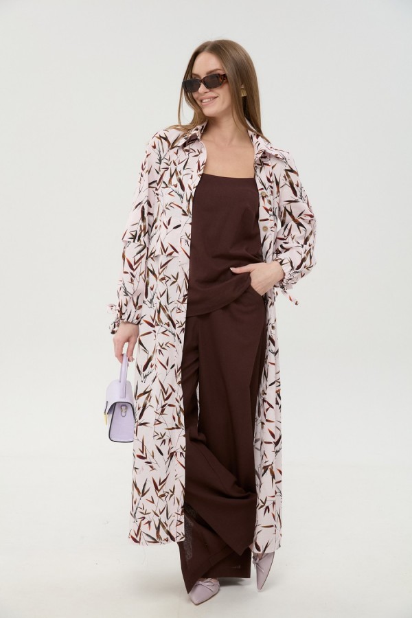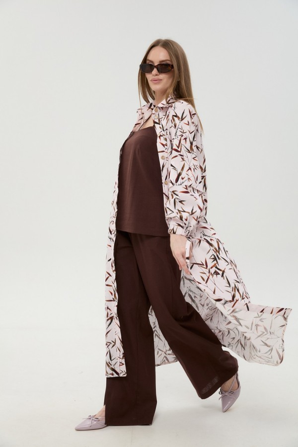 Костюм трехпредметный: состоит из кардигана-платья, брюк и топа. Платье-кардиган макси с центральной отрезной застёжкой на потайную планку на петли и пуговицы. По переду и спинке цельнокроеные складки на уровне талии. Рукав втачной, одношовный рубашечного типа. По низу рукава пробиты петли и вставлена завязка для фиксации сборки . Воротник рубашечный стояче отложной. В комплект к изделию идёт пояс из основной ткани для максимально комфортного регулирования объёма. Брюки свободного кроя, верхний срез представлен широкой резинкой, с карманами. По центру правой брючины расположена планка с функционирующими петлями и пуговицами. Топ на тонких регулируемых бретелях.