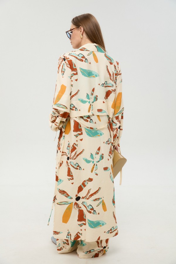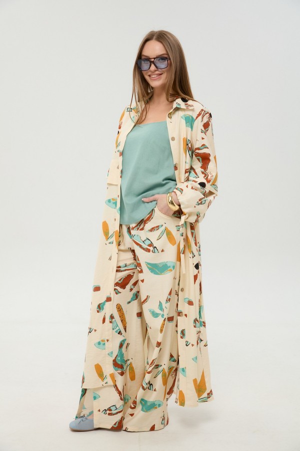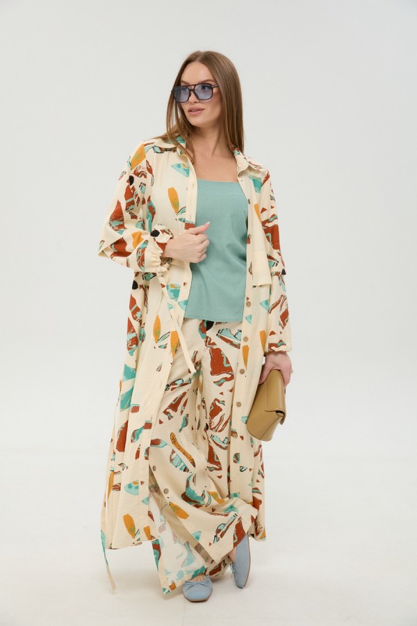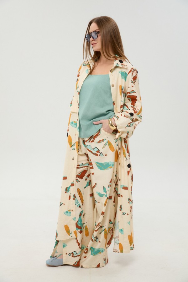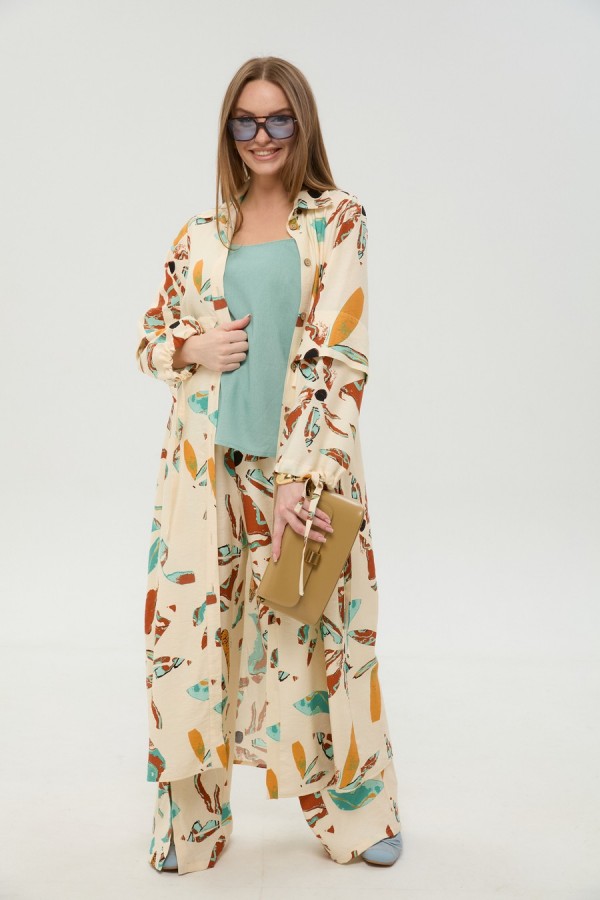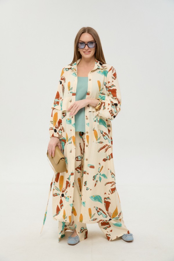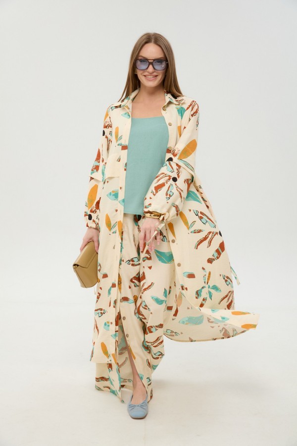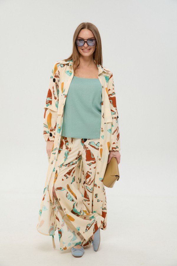 Костюм трехпредметный: состоит из кардигана-платья, брюк и топа. Платье-кардиган макси с центральной отрезной застёжкой на потайную планку на петли и пуговицы. По переду и спинке цельнокроеные складки на уровне талии. Рукав втачной, одношовный рубашечного типа. По низу рукава пробиты петли и вставлена завязка для фиксации сборки . Воротник рубашечный стояче отложной. В комплект к изделию идёт пояс из основной ткани для максимально комфортного регулирования объёма. Брюки свободного кроя, верхний срез представлен широкой резинкой, с карманами. По центру правой брючины расположена планка с функционирующими петлями и пуговицами. Топ на тонких регулируемых бретелях.