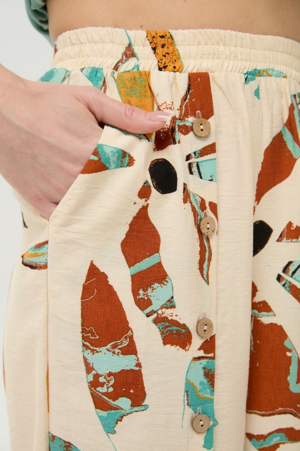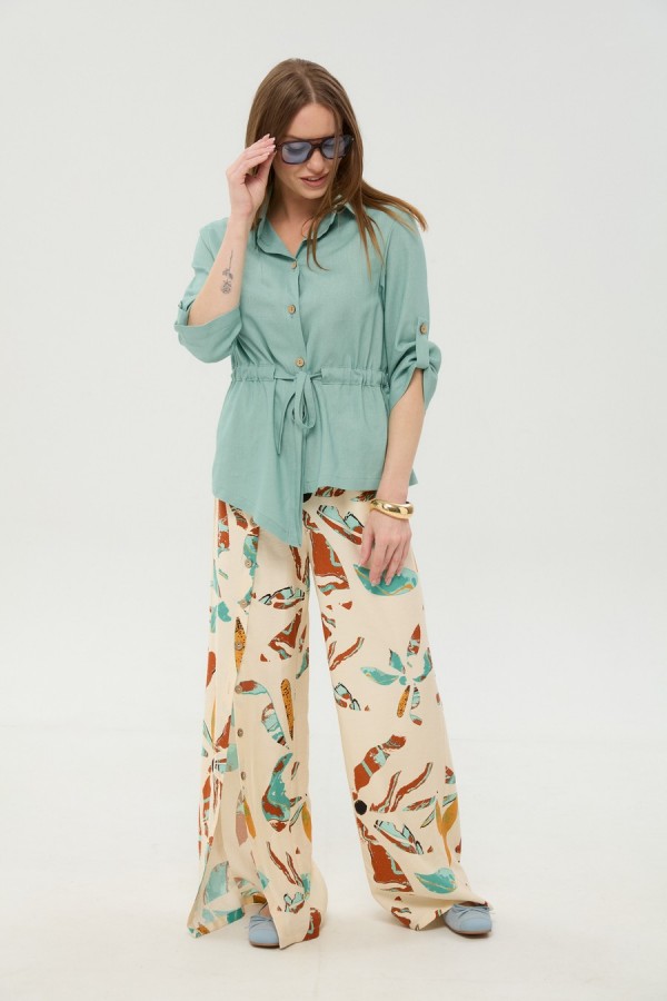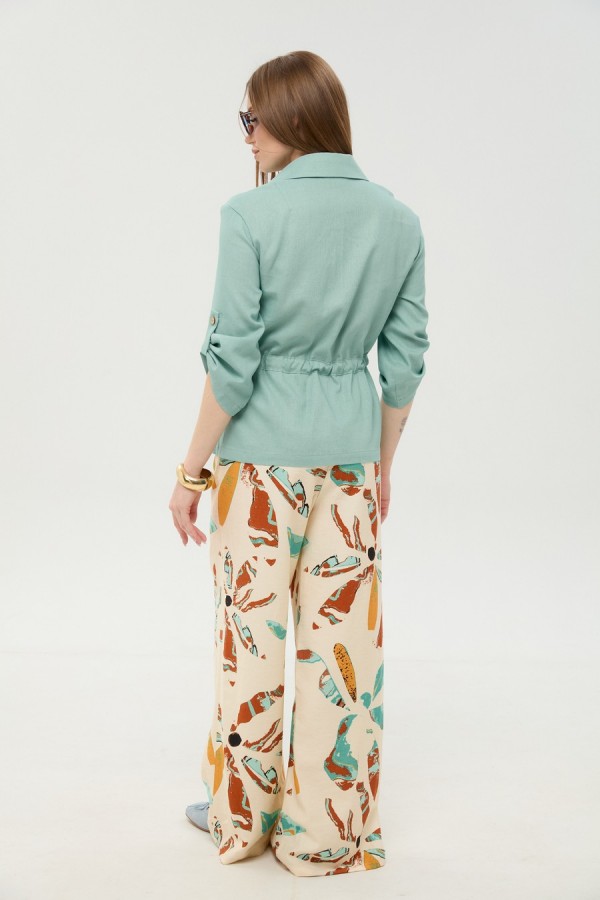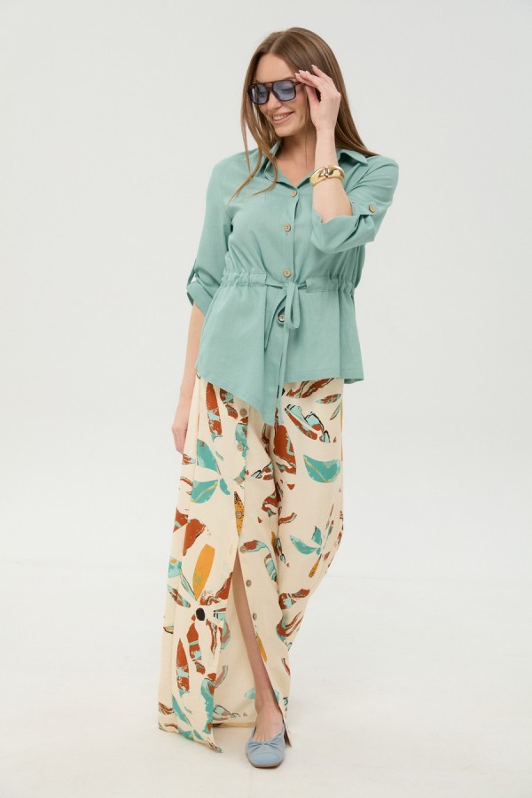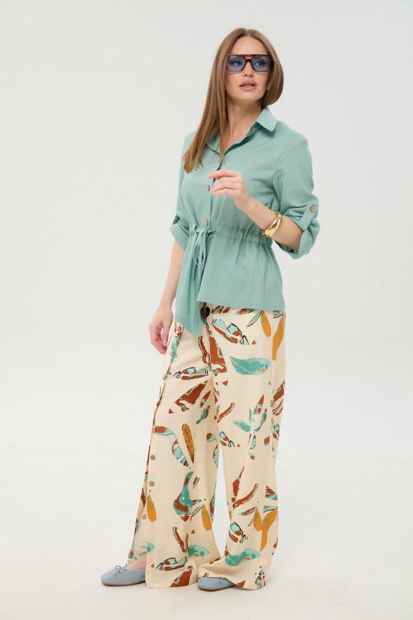 Костюм двухпредметный: состоит из жакета и брюк. Жакет прямого силуэта, воротник пиджачного типа, рукав одношовный, втачной с незначительно спущенной линией плеча, длиной три четверти, с патой. По линии ткани настрачная кулиса с завязками из основной ткани. Застежка центрально-бортовая. Линия низа верхней части фигурная ассиметричная. Брюки свободного кроя, верхний срез представлен широкой резинкой, с карманами. По центру правой брючины расположена планка с функционирующими петлями и пуговицами.