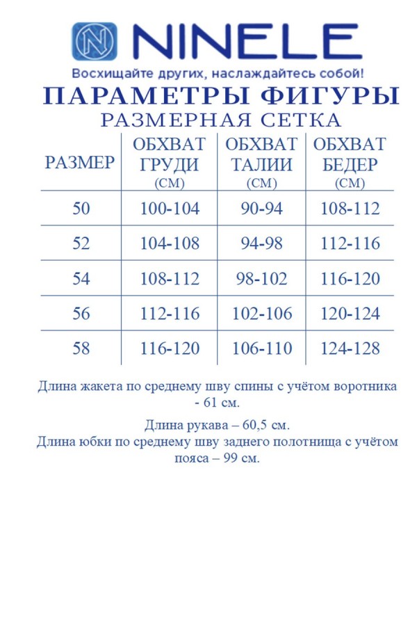 Состав:жакет -- полиэстер 100%; подкладка жакета – полиэстер 55%, вискоза 45%; юбка – полиэстер 100%, подкладка юбки –ПЭ 100%