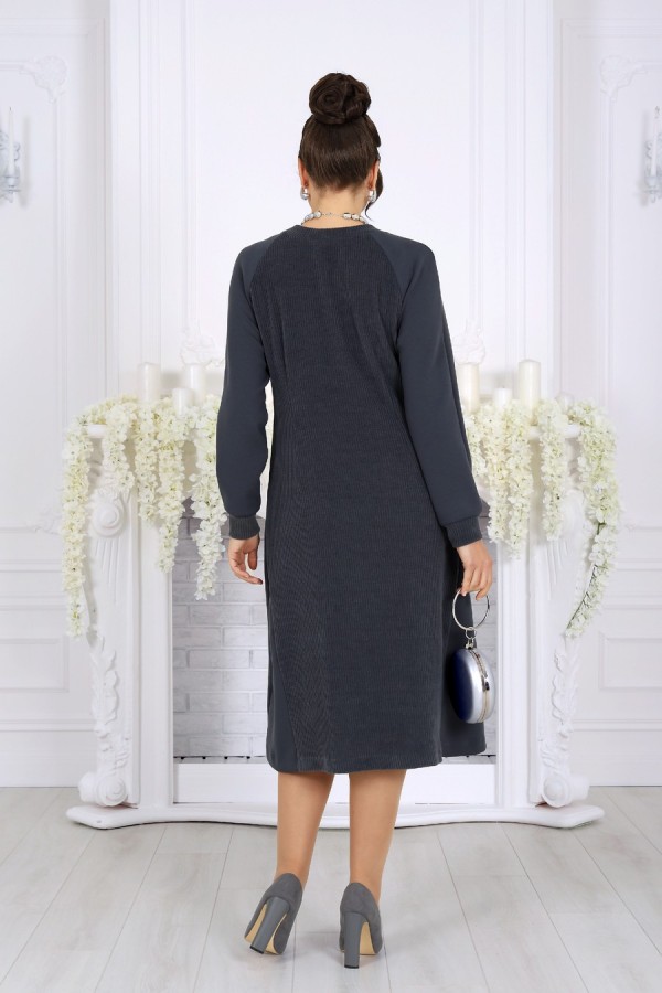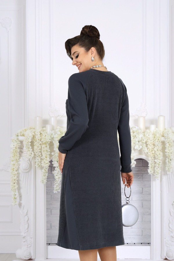Элегантное и по-настоящему универсальное платье, которое легко впишется как в деловой гардероб, так и в образ для торжественного случая. Модель создана с акцентом на комфорт, тепло и безупречную посадку, особенно для женщин с формами. Платье выполнено из фактурного трикотажного полотна с рубчиком — материал приятен к телу, хорошо держит форму и мягко подчеркивает силуэт. Полуприлегающий крой визуально вытягивает фигуру, а притачные клинья по боковым швам в нижней части платья добавляют свободы движений и легкое расширение к низу, создавая гармоничные пропорции. Контрастные отделочные элементы из гладкого трикотажа придают модели современный и стильный вид: боковые клинья, детали рукавов и фигурный накладной карман на переде делают образ выразительным, но не перегруженным. Круглая горловина аккуратно оформлена бейкой из основного полотна, а длинные рукава реглан с манжетами обеспечивают дополнительный комфорт и свободу движений. Это платье — идеальный выбор для офиса, деловых встреч, семейных мероприятий и повседневных выходов в холодное время года. Оно удобно, практично и при этом выглядит элегантно и ухоженно. Платье полуприлегающего силуэта, выполнено из фактурного трикотажного полотна с рубчиком. На продолжении боковых швов, в нижней части платья – притачные клинья, придающие силуэту расширение к низу. Модель без подкладки, без застежки и плечевых накладок. Перед с нагрудными вытачками, направленными от пройм, спинка – с талиевыми. В верхней части переда настрочен фигурный накладной карман. Круглая горловина оформлена бейкой из основного полотна. Рукав длинный, реглан, с притачной манжетой без застежки. Боковые клинья платья, детали рукава и карман выполнены из гладкого отделочного трикотажного полотна. Длина платья – 110 см; длина рукава (от горловины, с манжетой) – 71 см.