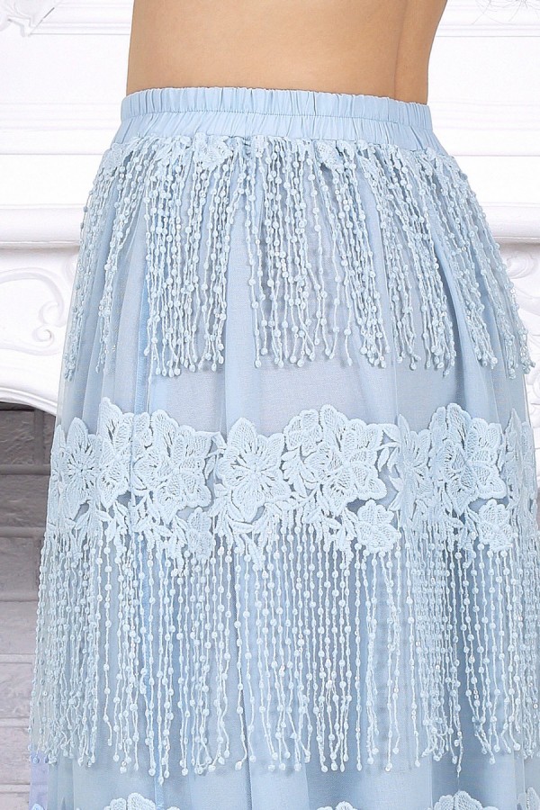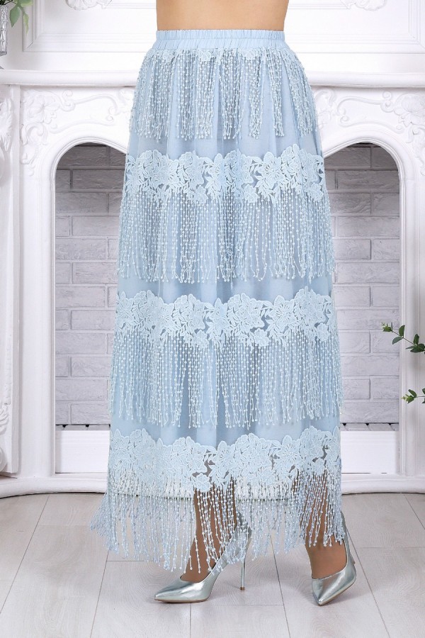 Изысканный комплект, который легко становится основой праздничного и вечернего образа. Эффектная юбка в пол с воздушной фактурой и выразительным декором красиво движется при ходьбе, создавая нарядное настроение, а лаконичная блузка из вискозы мягко уравновешивает образ и делает его особенно элегантным. Костюм смотрится дорого, женственно и при этом остаётся удобным для целого дня. Продуманный крой подходит для весеннего и летнего сезона, комфортно садится на фигуру и особенно удачен для больших размеров. Эластичный пояс, мягкие материалы и гармоничное сочетание фактур обеспечивают свободу движения и приятную посадку. Универсальный комплект с белорусским качеством легко подойдёт как для торжества, так и для любого случая, где хочется выглядеть эффектно. Комплект женский 2-х предметный, состоящий из блузки и юбки. Блузка полуприлегающего силуэта, выполнена из вискозы. Горловина по спинке округлая, по переду округлая углубленная. Рукав короткий, втачной, низ рукава обработан кружевом с фестоном. По переду блузки есть центральный шов и на него настрочено кружево с фестоном. Длина блузки –54 см; длина рукава –27 см. Юбка прямая, расширенная к низу. Модель двухслойная: верхний выполнен из сетки с вышивкой, нижний из хлопчатобумажного подкладочного полотна. Юбка без застежки, на притачном поясе с протянутой внутрь эластичной лентой.