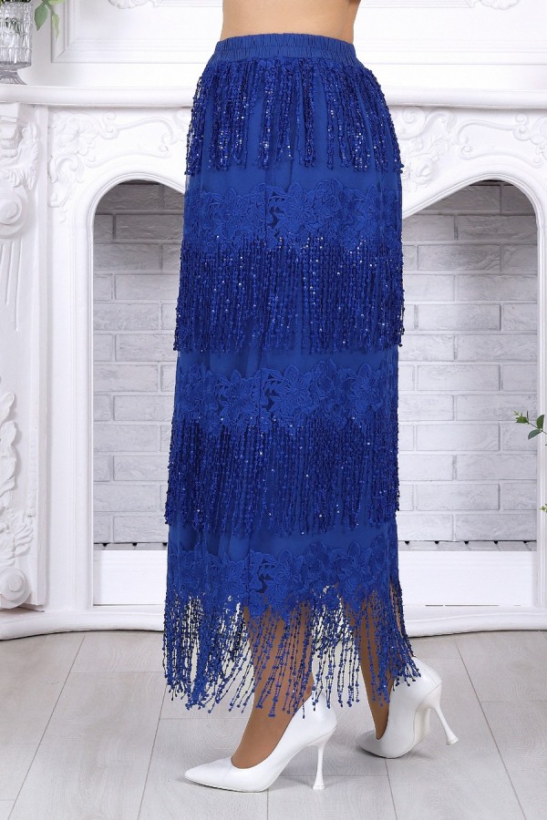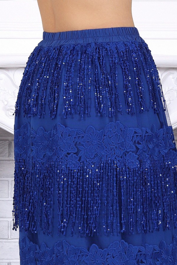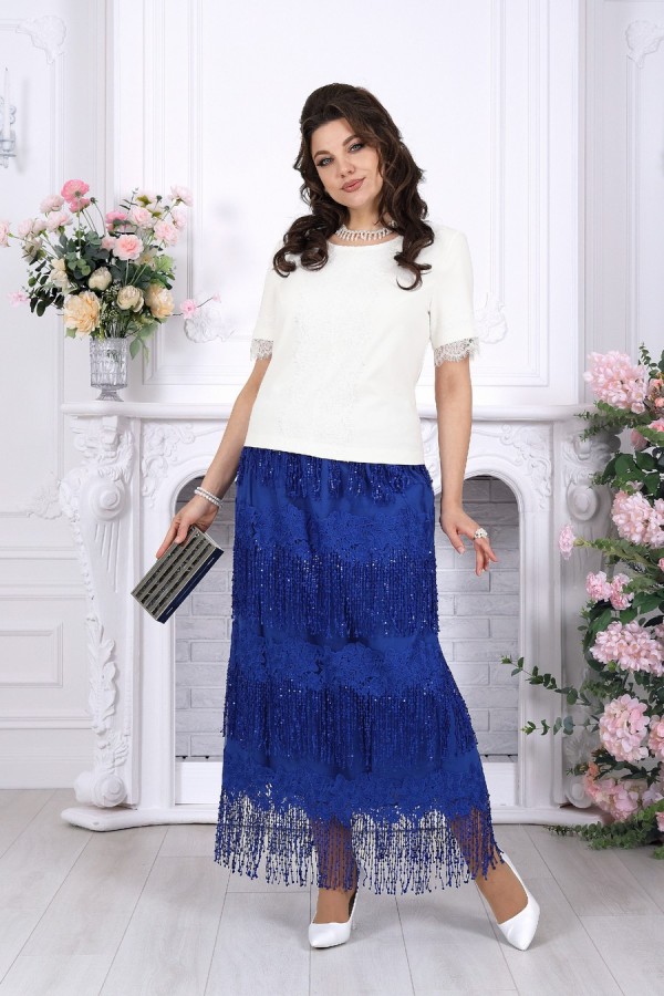 Изысканный комплект, который легко становится основой праздничного и вечернего образа. Эффектная юбка в пол с воздушной фактурой и выразительным декором красиво движется при ходьбе, создавая нарядное настроение, а лаконичная блузка из вискозы мягко уравновешивает образ и делает его особенно элегантным. Костюм смотрится дорого, женственно и при этом остаётся удобным для целого дня. Продуманный крой подходит для весеннего и летнего сезона, комфортно садится на фигуру и особенно удачен для больших размеров. Эластичный пояс, мягкие материалы и гармоничное сочетание фактур обеспечивают свободу движения и приятную посадку. Универсальный комплект с белорусским качеством легко подойдёт как для торжества, так и для любого случая, где хочется выглядеть эффектно. Комплект женский 2-х предметный, состоящий из блузки и юбки. Блузка полуприлегающего силуэта, выполнена из вискозы. Горловина по спинке округлая, по переду округлая углубленная. Рукав короткий, втачной, низ рукава обработан кружевом с фестоном. По переду блузки есть центральный шов и на него настрочено кружево с фестоном. Длина блузки –54 см; длина рукава –27 см. Юбка прямая, расширенная к низу. Модель двухслойная: верхний выполнен из сетки с вышивкой, нижний из хлопчатобумажного подкладочного полотна. Юбка без застежки, на притачном поясе с протянутой внутрь эластичной лентой.