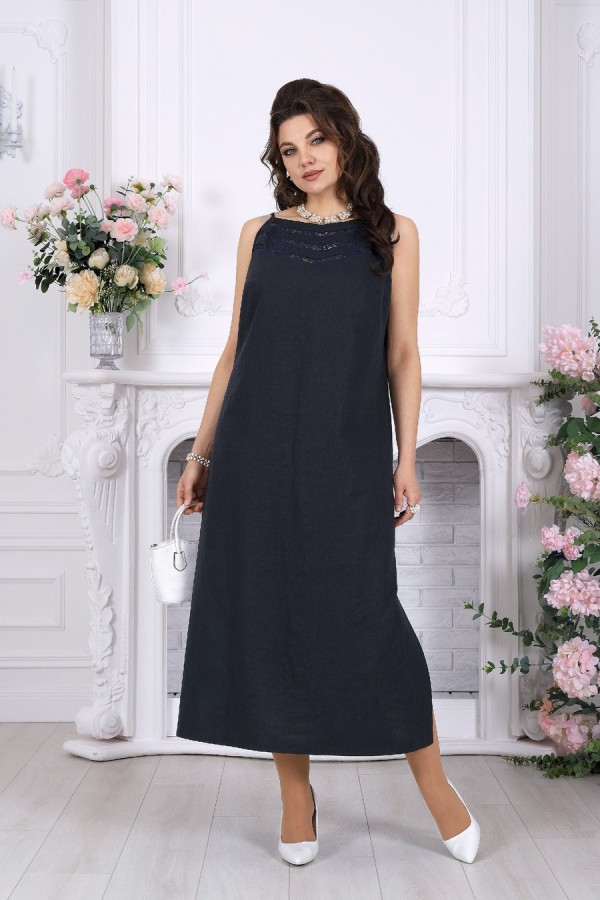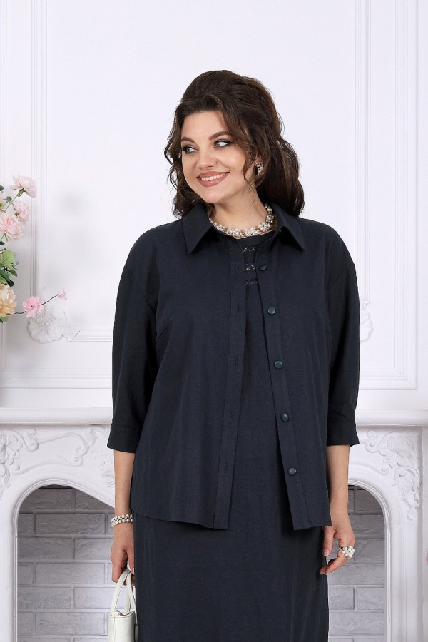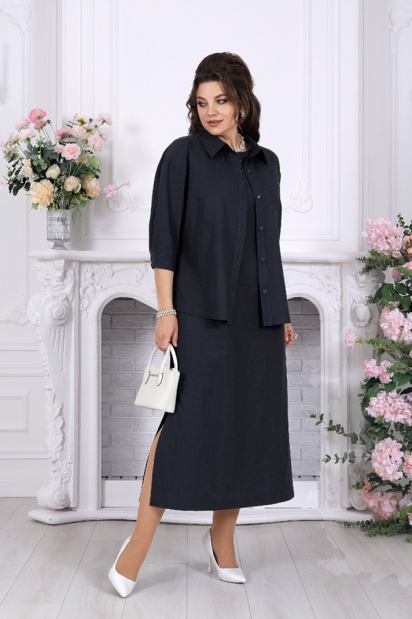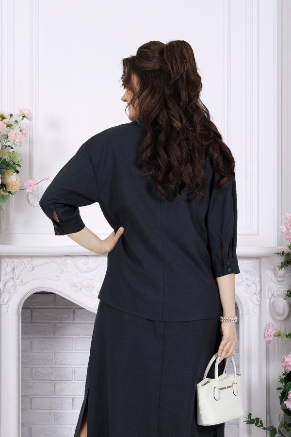 Элегантный женский костюм-двойка из натуральной льняной ткани — удачное решение для лета и весны, когда хочется выглядеть женственно, собранно и при этом чувствовать себя комфортно. Лаконичная блузка прямого силуэта со спущенной линией плеча и воротником на стойке сочетается с сарафаном А-силуэта на регулируемых бретелях. Декоративные вставки из гипюра добавляют образу мягкую нарядность, а хлопковая подкладка и разрезы по боковым швам делают модель удобной в носке. Костюм легко впишется в повседневный, офисный и деловой гардероб, а при правильных аксессуарах станет и достойным вариантом для более торжественного выхода. Белорусское качество, универсальность и комфорт для больших размеров — в модели, которая красиво садится и подчёркивает образ без лишней строгости. Комплект женский 2-х предметный, состоящий из блузки и сарафана. Блузка прямого силуэта со спущенной линией плеча, выполнена из льняной ткани. Перед с нагрудными вытачками, направленными от пройм и с центральной застёжкой на 6 петель и 6 пуговиц по притачной планке. Спинка блузки со средним швом. Горловина оформлена отложным воротником на отрезной стойке. Низ переда и спинки закруглён к боковым швам и переходит в разрезы. Рукав втачной, длиной ¾, низ рукава обработан притачной манжетой, с застёжкой на две петли и две пуговицы. Длина блузки –66 см; длина рукава –55 см. Сарафан А силуэта на бретельках с регулировкой, изготовлен из льняной ткани. Перед с нагрудными вытачками, направленными от пройм, спинка со средним швом. В сарафане по переду горловина V-образная и обработаны декоративные вставки из гипюра. Сарафан на хлопчатобумажной подкладке и с разрезами по боковым швам. Длина сарафана – 112 см.