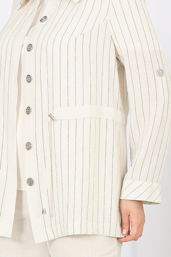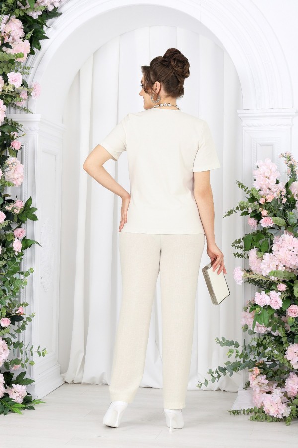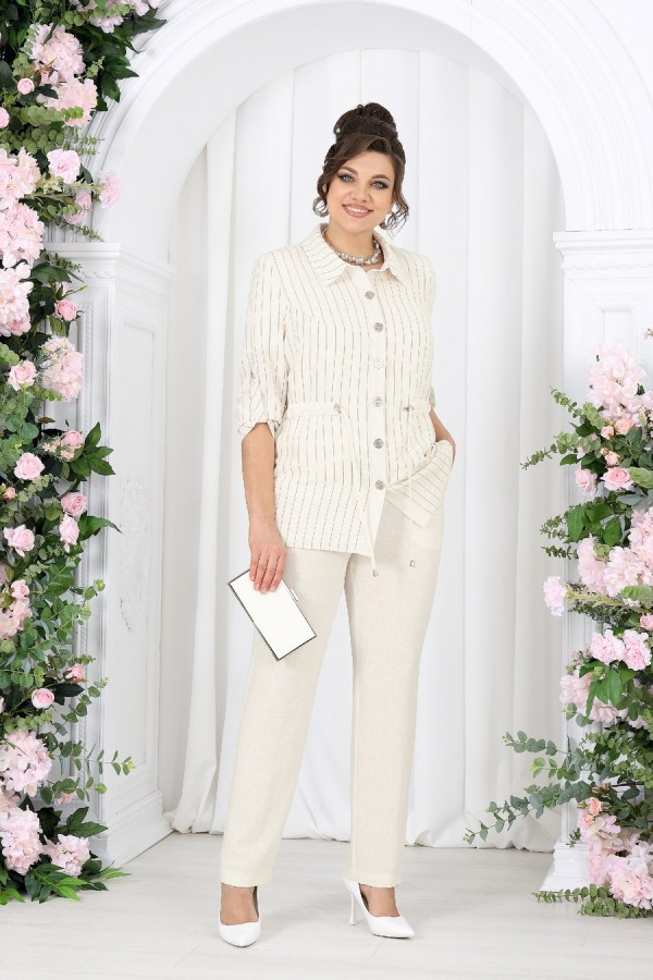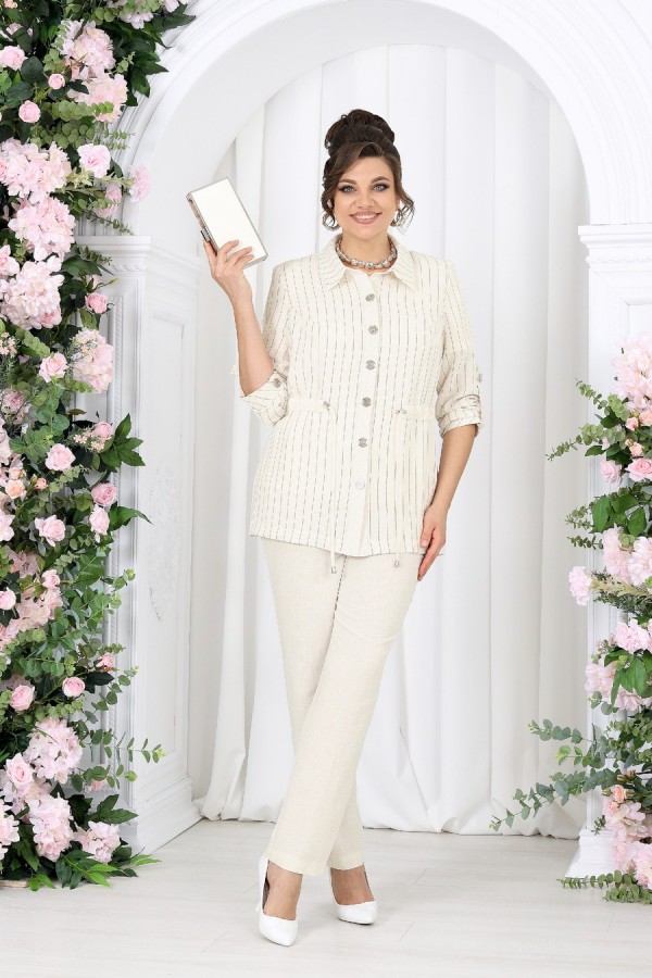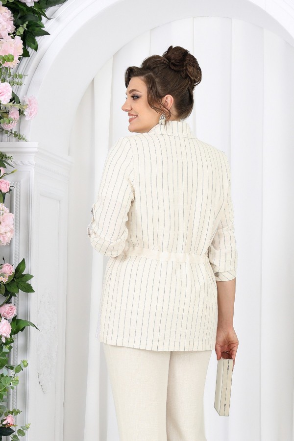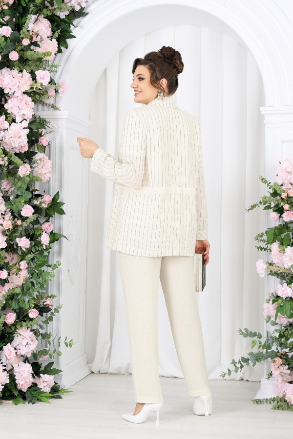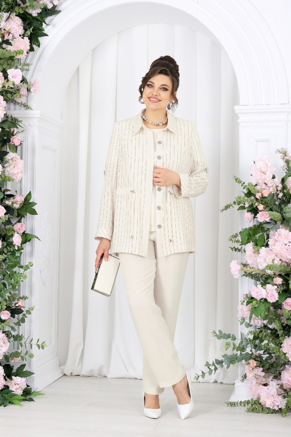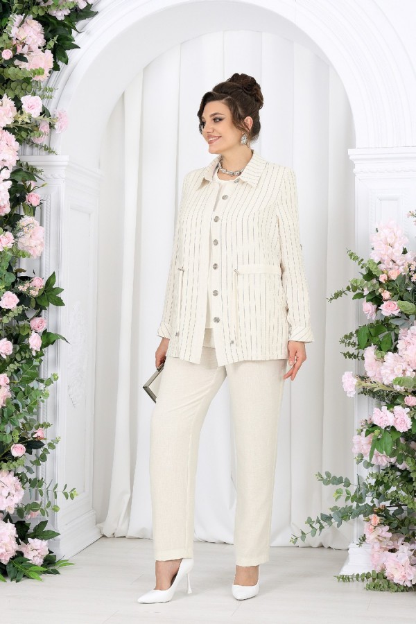 Брючный костюм тройка - элегантность, комфорт и белорусское качество Жакет прямого силуэта выполнен из костюмно-плательной ткани лён в полоску — смотрится статусно и визуально вытягивает силуэт. Регулируемая кулиса подчёркивает талию и позволяет настроить посадку под фигуру. Рукава с патами дают возможность менять длину, создавая более расслабленный или деловой образ. Брюки из однотонной льняной костюмной ткани с резинкой по всей линии пояса обеспечивают комфортную посадку, не сковывают движения и отлично подходят для женщин больших размеров и для полных. Джемпер из мягкого трикотажного полотна гармонично дополняет комплект — его можно носить как в составе костюма, так и отдельно. Этот костюм — удачное решение, если нужен офисный, деловой, повседневный или нарядный образ, который выглядит дорого и при этом остаётся удобным. Комплект брючный 3-х предметный, состоящий из жакета, брюк и джемпера. Жакет выполнен из костюмно-плательной ткани лён полоска, брюки выполнены из костюмно-плательной ткани лён однотон, джемпер выполненный из трикотажного полотна. Жакет прямого силуэта, с центральной бортовой застежкой с отрезными планками на 7 петель и 7 пуговиц, со стояче-отложным воротником с отрезной стойкой. Длина изделия по центру спинки 73 см от шва втачивания воротника в горловину. Перед с нагрудными вытачками, выходящими из пройм. По спинке и частично по переду настрочена кулиса, в которую втянут шнур. Для регулировки сборки по кулисе на шнур продеты фиксаторы, концы шнура оформлены наконечниками. Рукава втачные, одношовные, с притачными манжетами, застегивающимися на 1 петлю и 1 пуговицу, с разрезами в нижних швах рукавов, с настрочёнными патами, застегивающимися на 1 петлю и 1 пуговицу. Длина рукава с манжетой 62 см. Длина рукава может регулироваться с помощью паты. Жакет с плечевыми накладками. Брюки с посадкой на талии, зауженные к низу, на притачном поясе с резинкой вдоль всего пояса. На передних половинках брюк расположены наклонные боковые карманы. Джемпер прилегающего силуэта. Перед с нагрудными вытачками, выходящими из пройм. Из горловины переда вниз выходят 4 складки. Горловина переда и спинки округлой формы, по переду углубленная. Срезы горловин окантованы косой бейкой. Рукава втачные, одношовные. Длина рукава 26 см