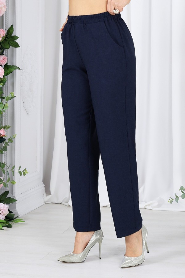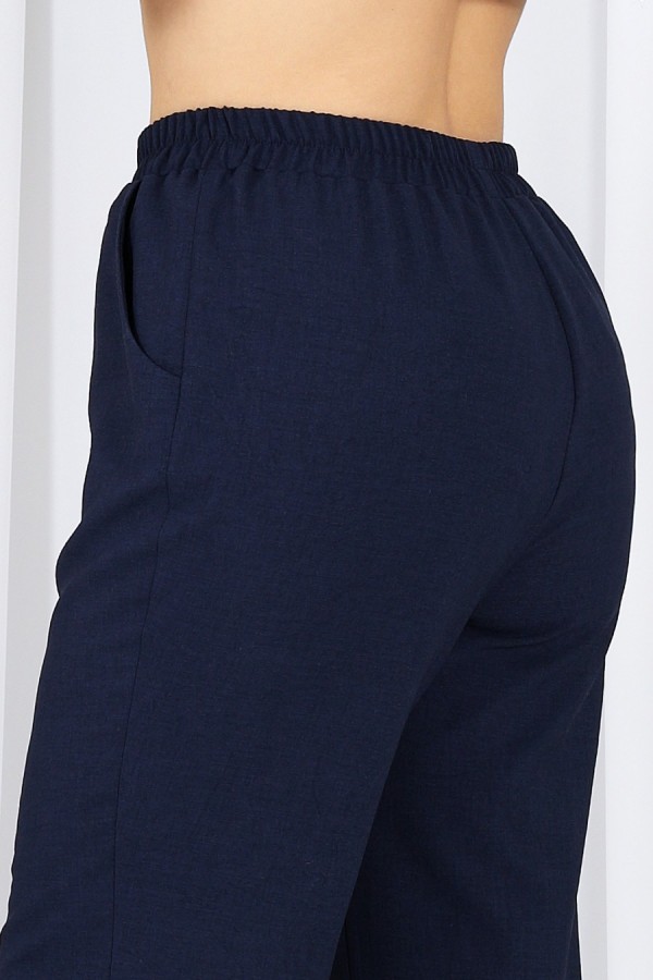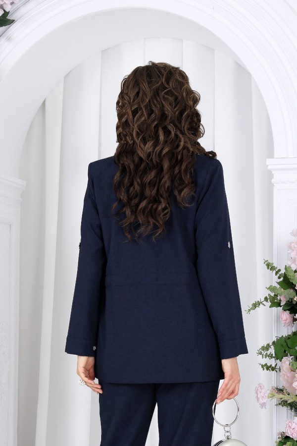Этот костюм - идеальное сочетание стиля, комфорта и практичности. Он подойдет как для деловых встреч, так и для повседневного использования, дополняя ваш образ уверенностью и элегантностью. Если вам нравится изделия из натурального льна, но надоело ходить всегда в мятой одежде, то ткань лен вишер эта ваше находка. Хотя в составе ткани не присутствует лен, она прекрасно дышит и полностью повторяет текстуру натурального льна, а самое главное она практически не мнется. Комплект брючный 3-х предметный, состоящий из жакета, джемпера и брюк. Жакет прямого силуэта, выполнен из ткани «лен-вишер». Модель без подкладки, с плечевыми накладками и однобортной внешней застежкой с отрезными планками на 7 петель и 7 пуговиц. Перед с нагрудными вытачками, выходящими из пройм. В нижней части переда настрочены накладные карманы с бантовой складкой посередине кармана и клапаны, застегивающиеся на 1 петлю и 1 пуговицу. По спинке и частично по переду настрочена кулиса, в которую втянут поясок из основной ткани. Для регулировки сборки по кулисе предусмотрены фиксаторы, концы пояса оформлены наконечниками. Горловина округлой формы со стояче-отложным воротником на отрезной стойке. Рукав втачной, длинный, с притачной манжетой, застегивающейся на 1 петлю и 1 пуговицу; по середине рукава настрочена пата, застегивающаяся на 1 петлю и 1 пуговицу, что позволяет регулировать длину рукава. Длина жакета - 71 см (46-50 р-р), 72 см (52-60 р-р), 73 см (62-66 р-р). Длина рукава (с манжетой) - 61 см. Джемпер полуприлегающего силуэта, выполнен из хлопкового трикотажного полотна. Перед с нагрудными вытачками, выходящими из пройм. От горловины вниз застрочены 4 складки. Горловина переда и спинки округлой формы, по переду углубленная. Срезы горловин окантованы косой бейкой. Рукав втачной, короткий. Длина джемпера -60 см (46-50 р-р), 65 см (52-60 р-р), 67 см (62-66 р-р). Длина рукава – 24,5 см (46-50 р-р), 25,5 см (52-60 р-р), 26,5 (62-66 р-р). Брюки классические длинные, прямого силуэта, с посадкой на талии, выполнены из ткани «лен-вишер». Модель без застёжки, на притачном поясе, с эластичной лентой внутри. Передние половинки брюк с боковыми наклонными карманами. Длина брюк по боковому (с поясом)-103 см (46-54 р-р), 104,5 см (56-60 р-р), 106 см (62-66 р-р).
