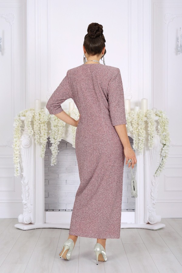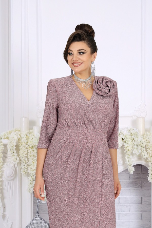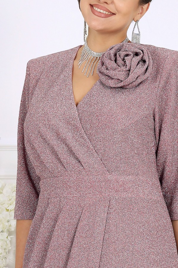 Стильное и эффектное платье для тех, кто хочет блистать на любом празднике. Модель выполнена из эластичного трикотажа с люрексом — ткань красиво переливается и подчёркивает изысканность образа. Удобный крой с акцентом на талию, запах и мягкие складки визуально вытягивают силуэт, а асимметричный низ добавляет динамики. Съемный цветок позволяет менять настроение образа — от сдержанного до яркого и романтичного. Это платье создано для женщин, которые ценят комфорт и красоту в каждом движении. Платье женское полуприлегающего силуэта, выполнено из трикотажного полотна с фактурной лицевой стороной «люрекс». Модель на трикотажной подкладке, с плечевыми накладками. На правой части переда, вдоль отрезного пояса, заложены косые односторонние складки; детали лифа и юбки скреплены на запах. Низ платья асимметричный: правая часть переда -- удлинена к центру и оформлена углом, левая -- скругленная и входит в правый боковой шов. На спинке обработаны талиевые вытачки. В левом боковом шве предусмотрена застежка на потайную тесьму-«молнию» (35 см). Рукав длиной 3/4, втачной. Платье дополнено съемным «цветком» из основного полотна. Длина платья-138 см; длина рукава-41 см.