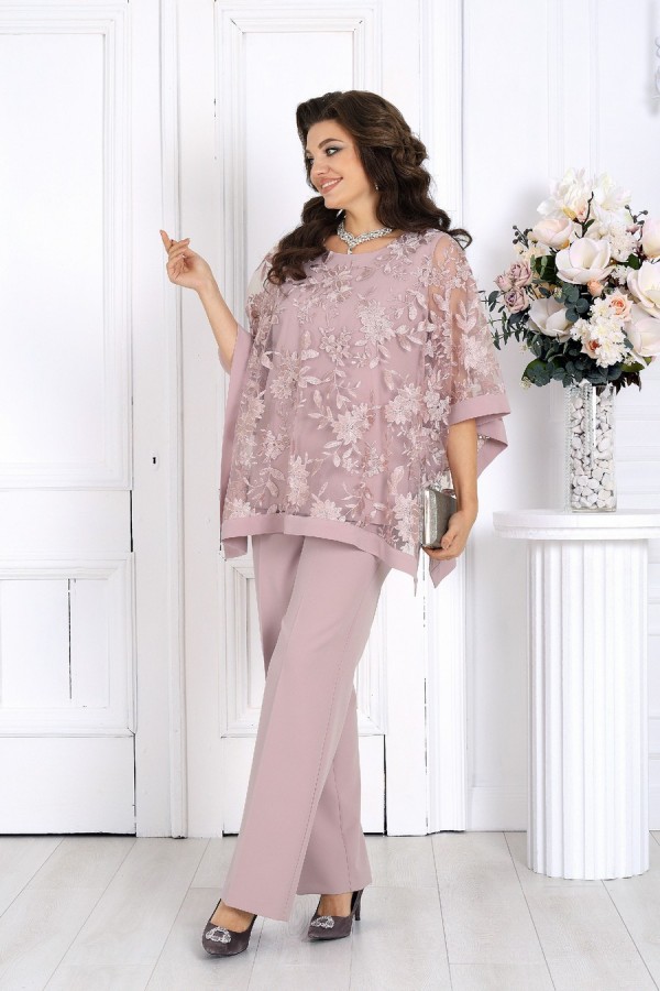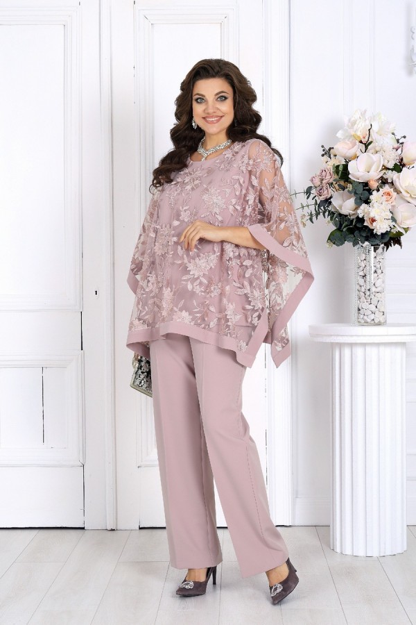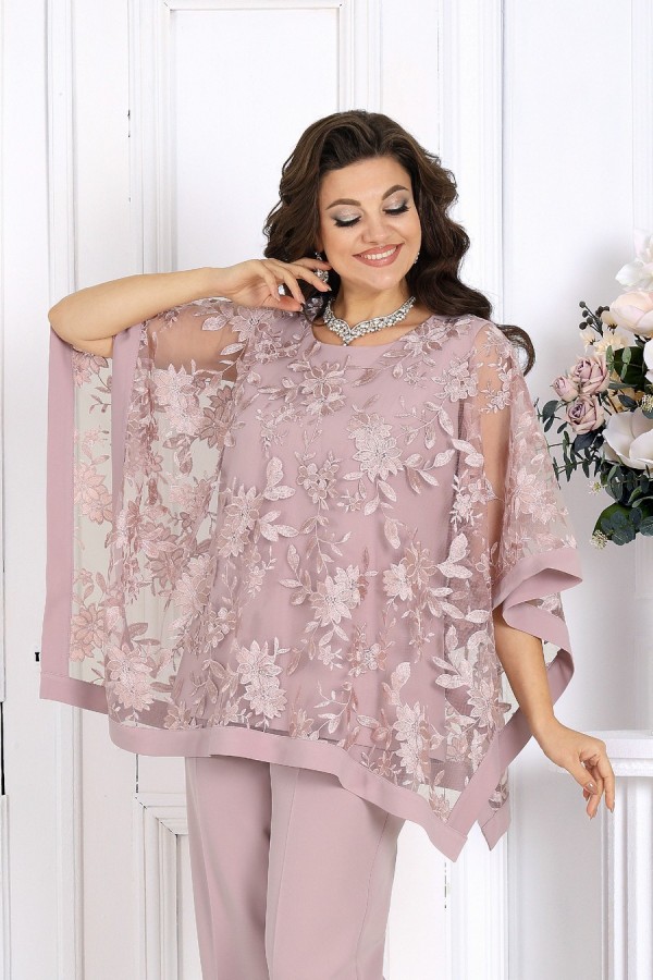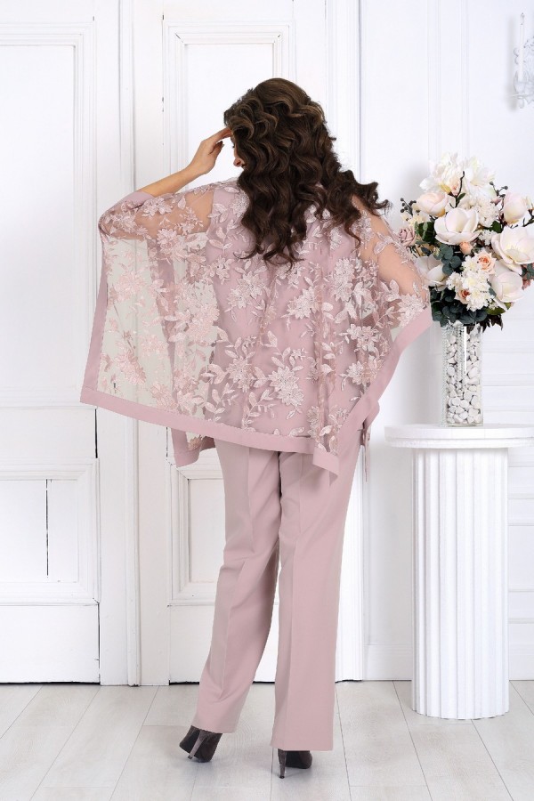 Элегантный костюм, который создан, чтобы подчеркнуть красоту и уверенность женщины в любой ситуации. Воздушный гипюр и струящиеся ткани создают утончённый образ, идеально подходящий для торжеств, свадеб, юбилеев и праздничных вечеров. Свободный крой и продуманная посадка делают костюм комфортным для женщин с формами — он не сковывает движения и красиво драпируется, визуально вытягивая силуэт. Верх выполнен в виде эффектной блузки из гипюра, которая мягко скрывает зону рук и талии, а классические брюки со стрелками придают образу стройность и изящество. Комплект брючный 2-х предметный, состоящий из блузки и брюк. Блузка, комбинированная, выполнена из костюмно-плательной ткани и гипюра. Модель без застежки и воротника, без рукавов и плечевых накладок. Блузка состоит из двух слоев: нижний представляет собой блузку полуприлегающего силуэта, с нагрудными вытачками по переду и талиевыми – по спинке; верхний слой выполнен в виде пончо прямоугольной формы с притачной бейкой по всем краям. Горловина круглой формы, углубленная спереди. Длина блузки – 65 см. Брюки классические, длинные, с посадкой на талии, выполнены из костюмно- плательной ткани. Модель со стрелками. Передние и задние половинки брюк с талиевыми вытачками, направленными от пояса вниз. Спереди обработаны наклонные боковые карманы и центральная застёжка на тесьму-«молнию». Притачной пояс застегивается на 1 петлю и 1 пуговицу; для лучшего прилегания по линии талии в притачном поясе предусмотрена эластичная лента, вставленная по спинке. Длина брюк по боковому (с поясом) – 107 см.