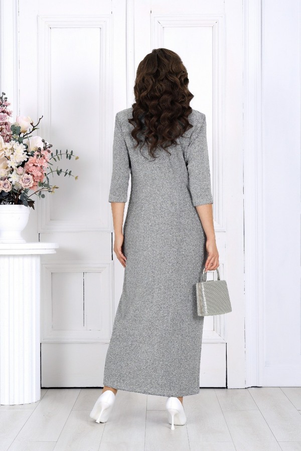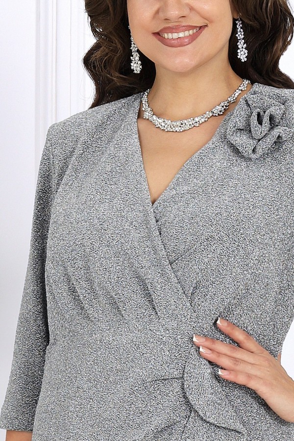 Ослепительное платье из мерцающего люрекса создано для тех, кто хочет выглядеть роскошно и уверенно на любом торжестве. Эта модель моментально притягивает взгляд — благородный блеск ткани, элегантный V-образный вырез, женственный запах и изящные складки создают по-настоящему праздничный образ, который подчёркивает фигуру и делает её зрительно стройнее. Платье продумано до мелочей, чтобы каждая женщина — в том числе в больших размерах — чувствовала себя уверенной, женственной и роскошной. Мерцающий люрекс под светом ламп и софитов смотрится особенно эффектно — идеально для свадьбы, юбилея, корпоратива, новогодней вечеринки или любого важного события, где нужно блистать. Съёмный декоративный цветок позволяет легко менять настроение образа: хочешь — создаёшь более торжественный акцент, хочешь — оставляешь чистую элегантную линию. Платье женское полуприлегающего силуэта, выполнено из трикотажного полотна с фактурной лицевой стороной «люрекс». Модель на трикотажной подкладке, с плечевыми накладками и застежкой в левом боковом шве на потайную тесьму-«молнию» (35 см). Перед отрезной по линии талии. Верхняя часть переда состоит из двух деталей, скрепленных на запах; вдоль горизонтального подреза заложены односторонние складки. На нижней части переда обработан рельефный шов с двойным воланом в верхней части и разрезом по низу; от шва к центру направлены односторонние складки. На спинке обработаны талиевые вытачки. Рукав трехчетвертной. Платье дополнено съемным «цветком» из основного полотна. Длина платья – 134 см; длина рукава – 42 см.