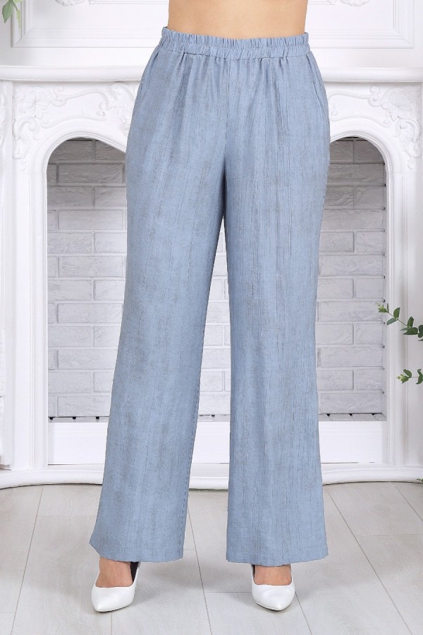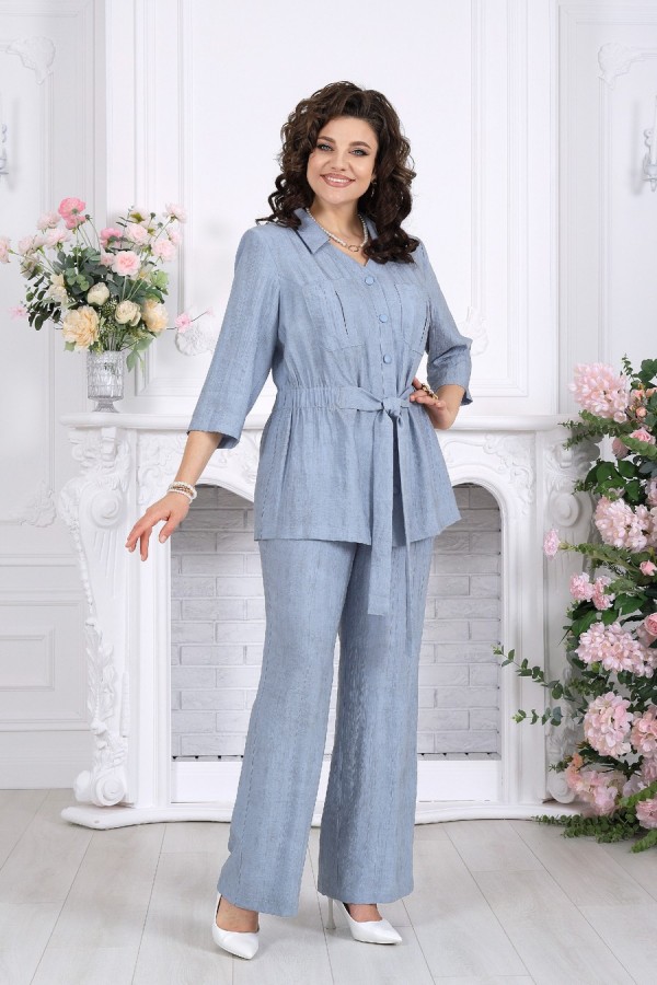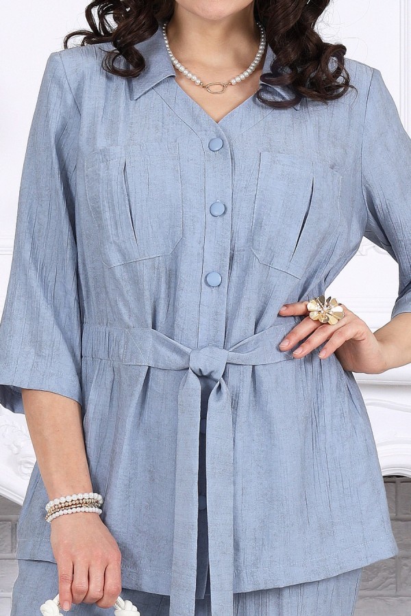 Брючный костюм — комфорт, который выглядит элегантно Этот комплект словно создан для тех дней, когда хочется выглядеть безупречно, не жертвуя удобством. Легкий, дышащий, пластичный — он мягко повторяет движения и подчеркивает естественную красоту силуэта. Блузка с аккуратным воротником и деликатной застежкой создает ощущение собранности и стиля, а пояс по линии талии позволяет подчеркнуть фигуру так, как хочется именно вам. Накладные карманы добавляют образу современности и легкой расслабленности. Брюки завершают комплект — прямые, струящиеся, они визуально вытягивают силуэт и дарят ощущение свободы в каждом шаге. Вискозное «крэш»-полотно — это баланс между натуральностью и практичностью. Оно легкое, дышащее, приятно к телу и не требует идеальной глажки, сохраняя эффект стильной фактурности. Комплект брючный 2-х предметный, состоящий из блузки и брюк. Блузка прямого силуэта, выполнена из вискозного полотна. Модель с втачным рукавом ¾ и плечевыми накладками. Перед с застежкой по притачной планке на 6 петель и 6 пуговиц. Горловина оформлена отложным воротником. Перед блузки с накладными карманами по линии груди. По линии талии спинки и частично переда с изнанки настрочена кулиса с широкой эластичной лентой внутри. По талии переда настрочен пояс. Длина блузки – 70 см (50-58 р-р); длина рукава (от горловины) – 44 см (50-52 р-р). Брюки длинные, прямого силуэта, с посадкой на талии, выполнены из вискозного полотна. Модель без стрелок, без застежки, с наклонными боковыми карманами, на притачном поясе с эластичной лентой внутри. Спереди обработаны наклонные боковые карманы. Длина брюк по боковому (с поясом) – 107 см (50-58 р-р).