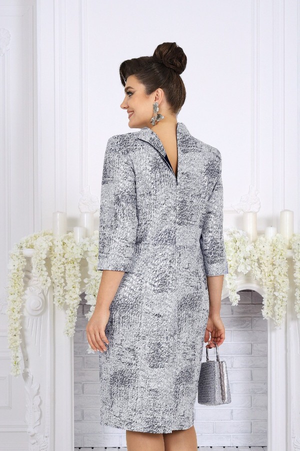 Это платье — настоящий образ для торжества, когда нужна безупречная посадка, статусный вид и ощущение роскоши. Сдержанная, но выразительная ткань с мерцающим напылением придает глубину и праздничный блеск, который выглядит дорого и уместно на свадьбе, юбилее или вечернем приёме. Форма — полуприлегающая, с тщательно продуманными линиями и опорой на женственные пропорции. Рельефы, начинающиеся от пройм, формируют стройные вертикали; V‑образный вырез подчёркивает линию шеи, добавляя лёгкий акцент элегантности. Визуальная центровка фасада вверху и строгие, но нежные детали внизу делают силуэт аккуратным и собранным. Декоративные элементы: аккуратные пуговицы, клапаны с отделочными бейками — они бережно обрамляют талию, создавая «солидный» вид, без лишней пышности. Благодаря этому платье выглядит презентабельно и современно, оставаясь универсальным для любых торжеств, где важна сдержанная роскошь. Для удобства модель выполнена на трикотажной подкладке, а рукава до линии предплечья обеспечивают свободу движений и комфорт по температуре. Платье сохраняет форму, мягко облегает, но не обтягивает — отличный вариант и для больших размеров, и для женщин с формами. Почему это платье стоит выбрать именно сейчас: - праздничный, вечерний и свадебный формат с профессиональным, премиальным внешним видом; - подходит женщинам plus size — корректирует силуэт без компромисса по комфорту; - качественные ткани, аккуратная отделка и продуманный крой; - универсальная длина и стиль, уместные и в зале, и за столом, и на фотосессии. Платье женское, полуприлегающего силуэта, выполнено из жаккардового трикотажного полотна с напылением. Модель на трикотажной подкладке, с плечевыми накладками. Перед отрезной по линии талии: на верхней части обработаны рельефы, направленные от пройм, V-образный вырез и средний шов, декорированный пуговицами; на нижней части обработаны талиевые вытачки и настрочены клапаны с бейками по краю и пуговицами по центру. Спинка отрезная по линии талии; на верхней части обработаны рельефы, направленные от пройм, на нижней – талиевые вытачки и средний шов со шлицей. Горловина оформлена стойкой с закругленными концами. Застежка на потайную тесьму молнию расположена в среднем шве спинки и переходит на стойку. Рукав втачной, трехчетвертной. Бейки клапанов и обтяжные пуговицы выполнены из отделочного трикотажного полотна. Длина платья – 106 см; длина рукава – 45 см.