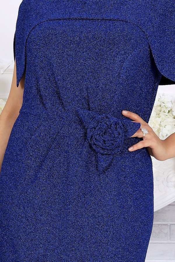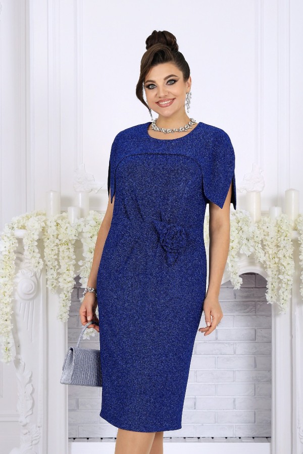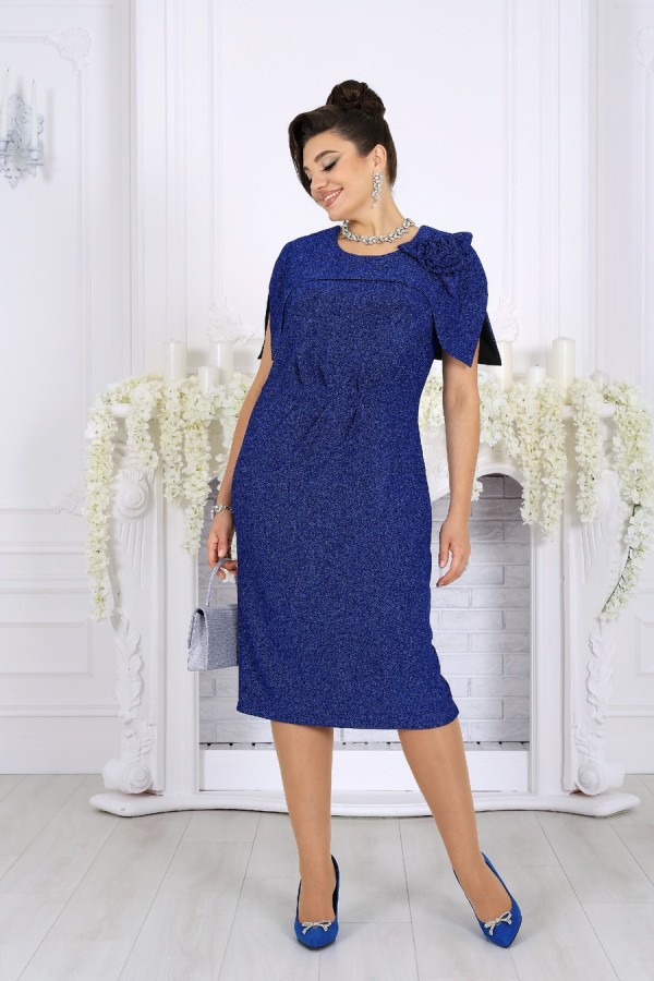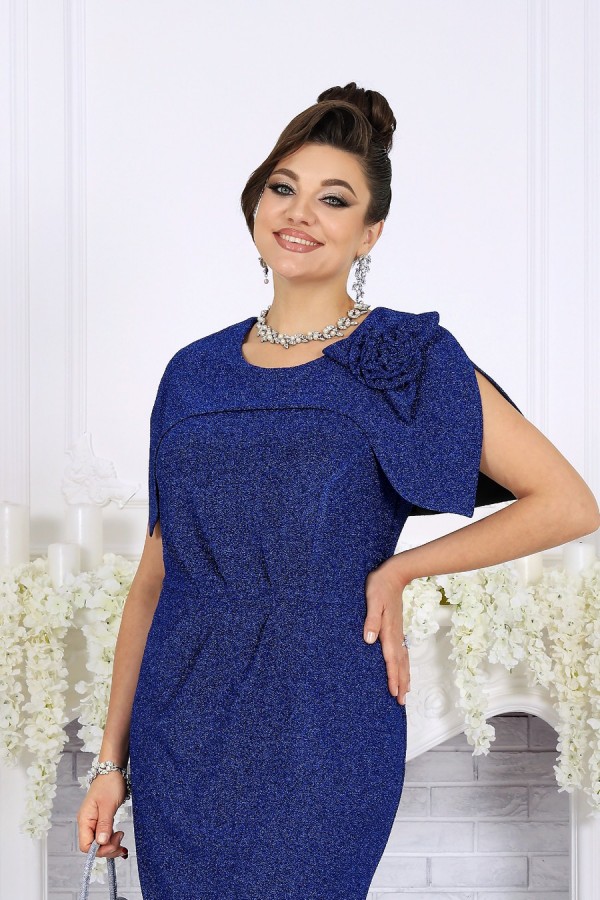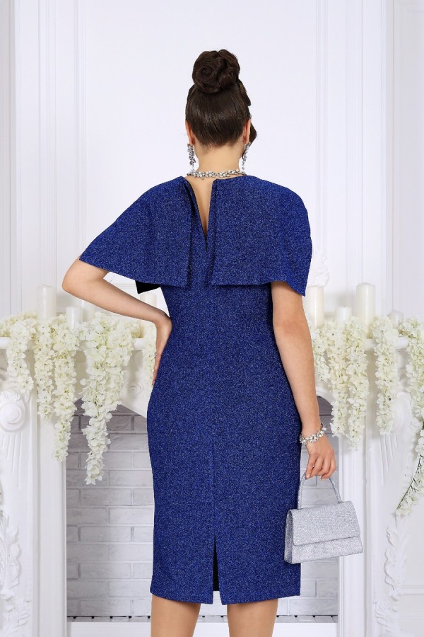 Элегантное женское платье создано для особых случаев, когда хочется выглядеть безупречно и чувствовать себя уверенно. Модель полуприлегающего силуэта мягко подчёркивает фигуру, визуально вытягивает силуэт и комфортно садится на фигуру, в том числе в больших размерах. Платье выполнено из эффектного трикотажного полотна с фактурной лицевой стороной «люрекс», которое красиво переливается при свете и придаёт образу праздничное настроение. Трикотажная подкладка обеспечивает комфорт при носке и идеальную посадку. Особый акцент модели — эффектная пелерина с фигурным низом и разрезами от плечевых швов. Она создаёт ощущение многослойности, скрывает зону плеч и рук и добавляет образу торжественности. Съёмный декоративный цветок позволяет менять настроение платья — от сдержанной классики до выразительного праздничного образа. Это платье станет идеальным выбором для свадьбы, торжественного вечера, юбилея, корпоратива или праздничного выхода, подчёркивая статус и вкус своей обладательницы. Платье женское полуприлегающего силуэта, выполнено из трикотажного полотна с фактурной лицевой стороной «люрекс». Модель на трикотажной подкладке, без воротника и рукавов, без плечевых накладок. Перед отрезной по линии талии; на верхней части обработан рельеф, направленный от левой проймы, на нижней части, на продолжении линии рельефного шва, обработана талиевая вытачка. По обе стороны от подреза талии переда застрочены косые односторонние складки. Спинка с талиевыми вытачками и средним швом, в верхней части которого обработана застежка на потайную тесьму-«молнию» (50см), в нижней – разрез. Горловина круглой формы, спереди углубленная. В шов обтачивания горловины входит пелерина с фигурным низом и разрезами от плечевых швов; пелерина разъемная по середине спинки. Платье дополнено съемным «цветком» из основного полотна. Длина платья - 106 см.
