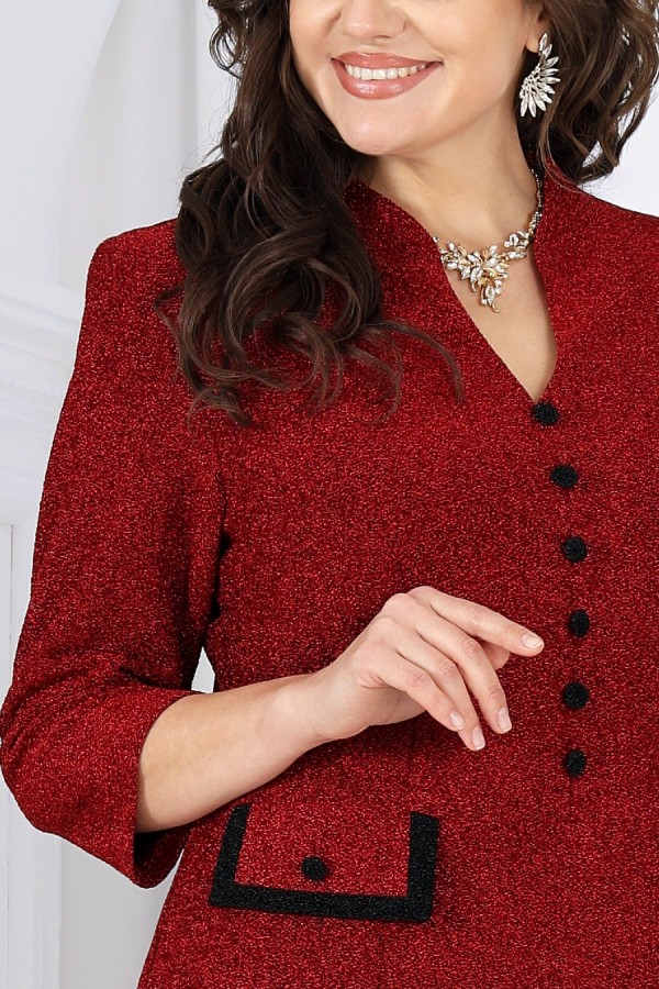 Это платье — настоящий образ для торжества, когда нужна безупречная посадка, статусный вид и ощущение роскоши. Сдержанная, но выразительная ткань с мерцающим блеском придает глубину и праздничный шик, который выглядит дорого и уместно на свадьбе, юбилее или вечернем приёме. Форма — полуприлегающая, с тщательно продуманными линиями и опорой на женственные пропорции. Рельефы, начинающиеся от пройм, формируют стройные вертикали; V‑образный вырез подчёркивает линию шеи, добавляя лёгкий акцент элегантности. Визуальная центровка фасада вверху и строгие, но нежные детали внизу делают силуэт аккуратным и собранным. Декоративные элементы: аккуратные пуговицы, клапаны с отделочными бейками — они бережно обрамляют талию, создавая «солидный» вид, без лишней пышности. Благодаря этому платье выглядит презентабельно и современно, оставаясь универсальным для любых торжеств, где важна сдержанная роскошь. Для удобства модель выполнена на трикотажной подкладке, а рукава до линии предплечья обеспечивают свободу движений и комфорт по температуре. Платье сохраняет форму, мягко облегает, но не обтягивает — отличный вариант и для больших размеров, и для женщин с формами. Почему это платье стоит выбрать именно сейчас: - праздничный, вечерний и свадебный формат с профессиональным, премиальным внешним видом; - подходит женщинам plus size — корректирует силуэт без компромисса по комфорту; - качественные ткани, аккуратная отделка и продуманный крой; - универсальная длина и стиль, уместные и в зале, и за столом, и на фотосессии. Платье женское, полуприлегающего силуэта, выполнено из трикотажного полотна с фактурной лицевой стороной «люрекс». Модель на трикотажной подкладке, с плечевыми накладками. Перед отрезной по линии талии: на верхней части обработаны рельефы, направленные от пройм, V-образный вырез и средний шов, декорированный пуговицами; на нижней части обработаны талиевые вытачки и настрочены клапаны с бейками по краю и пуговицами по центру. Спинка отрезная по линии талии; на верхней части обработаны рельефы, направленные от пройм, на нижней – талиевые вытачки и средний шов со шлицей. Горловина оформлена стойкой с закругленными концами. Застежка на потайную тесьму молнию расположена в среднем шве спинки и переходит на стойку. Рукав втачной, трехчетвертной. Бейки клапанов и обтяжные пуговицы выполнены из отделочного трикотажного полотна. Длина платья – 106 см; длина рукава – 45 см.