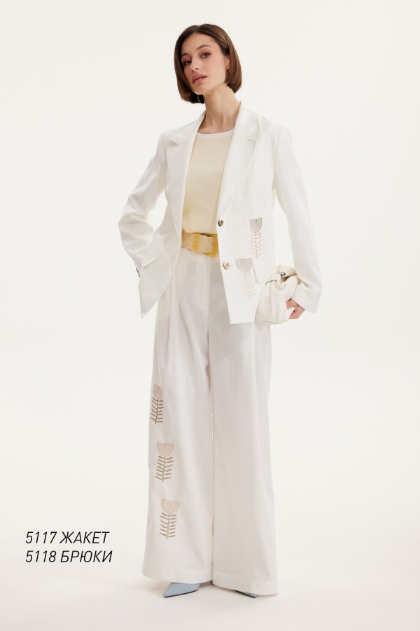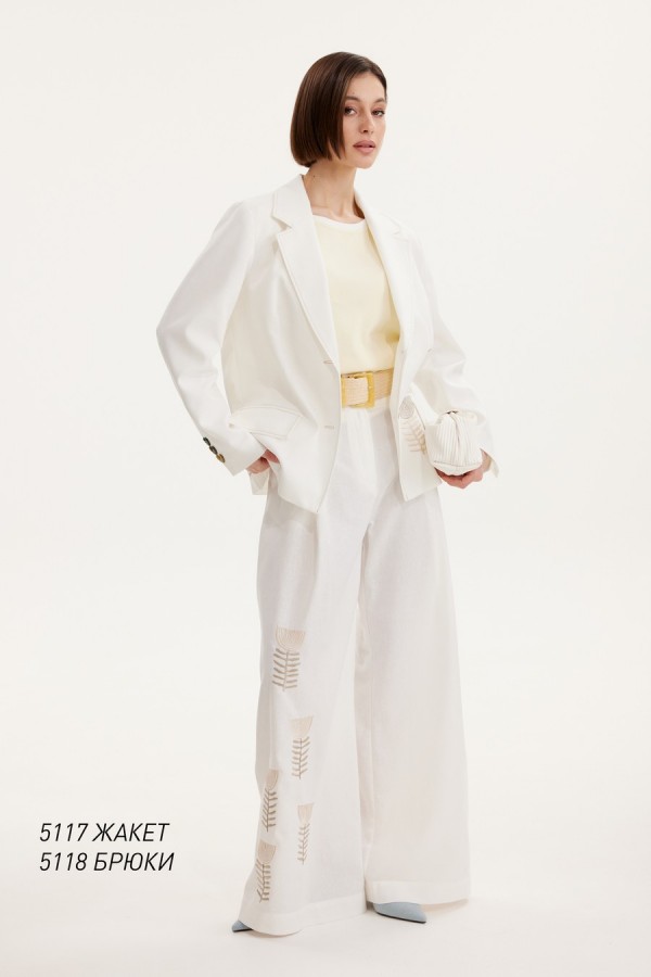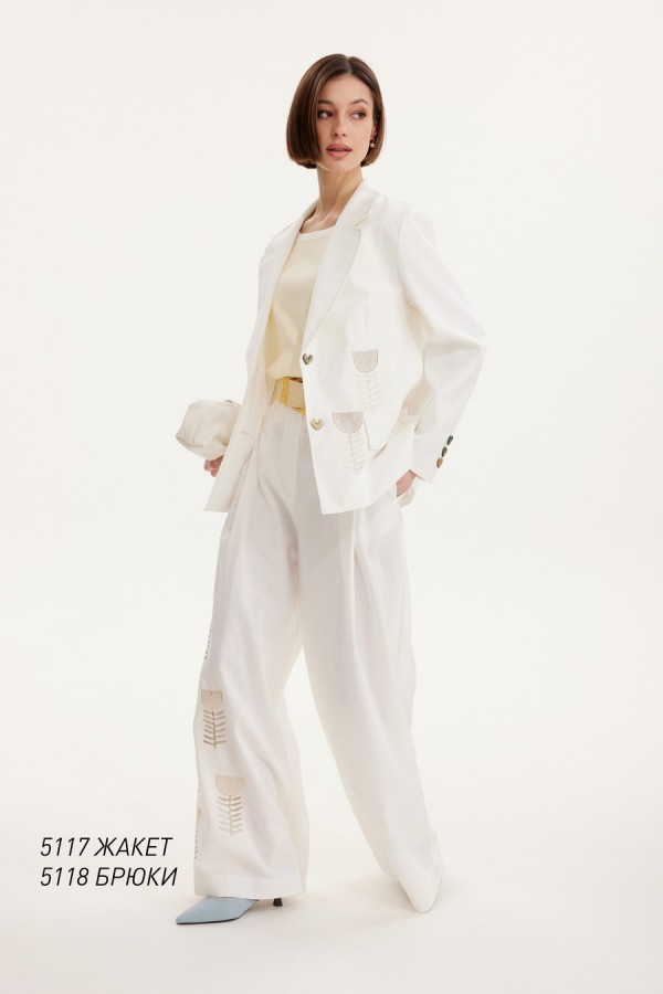 Жакет прямого силуэта из льняного полотна , со спущенным плечом, с центральной застежкой на петлях и пугавицах и удобными карманами. Жакет универсальной длины с воротником и лацканами. Полочка и спинка декорирована дизайнерской вышивкой.
