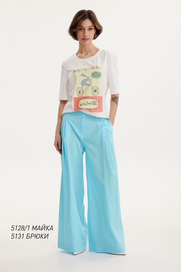 Стильная молодёжная майка в стиле Casual, из хлопкового трикотажного полотна. Модель свободной формы с коротким рукавом. Горловина оформлена тесьмой-довязом. Перед модели декорирован стильной дизайнерской печатью.