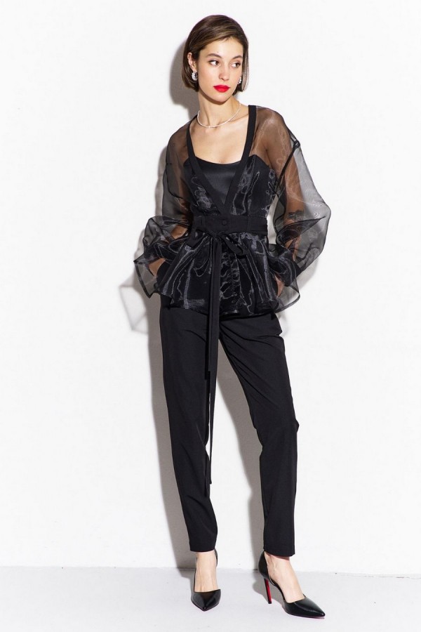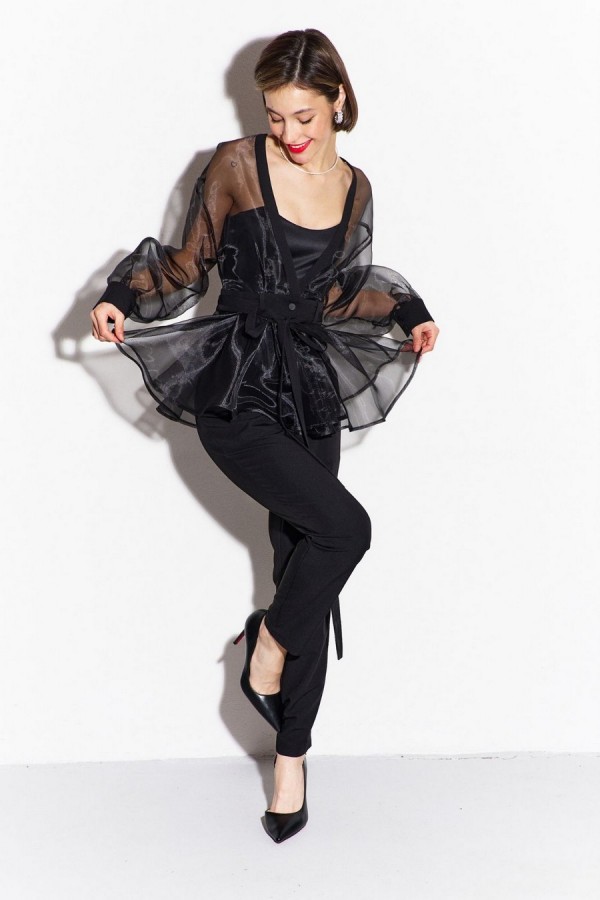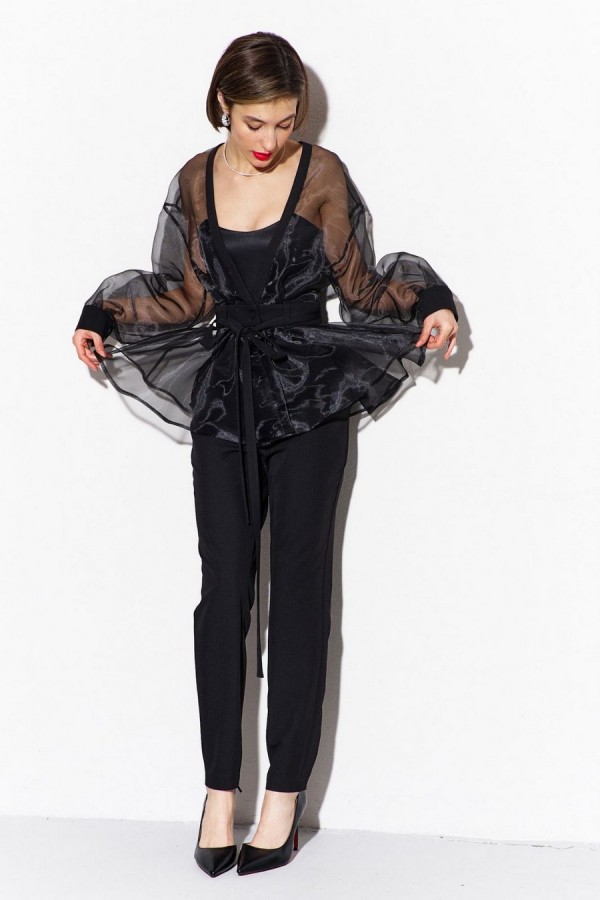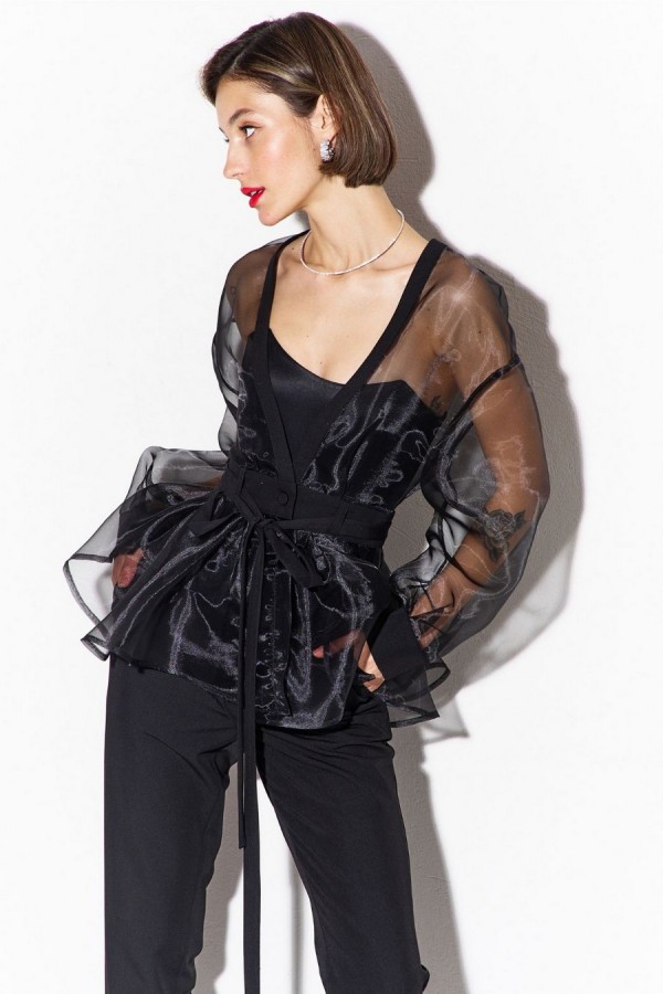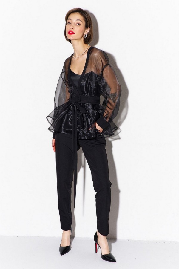 Состав:органза, костюмная ткань 65% вискоза, 32% ПЭ, 3%спандекс