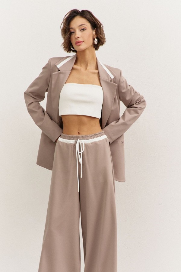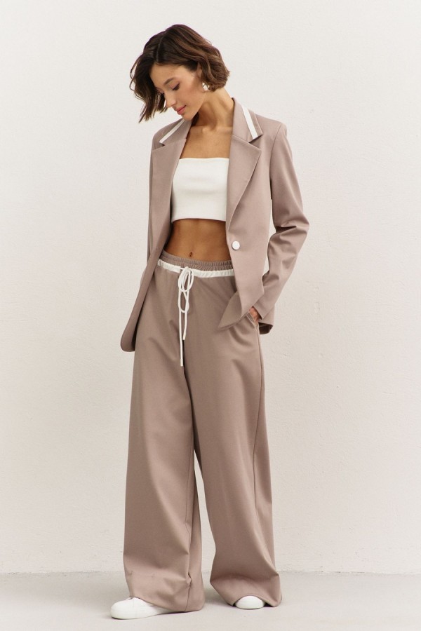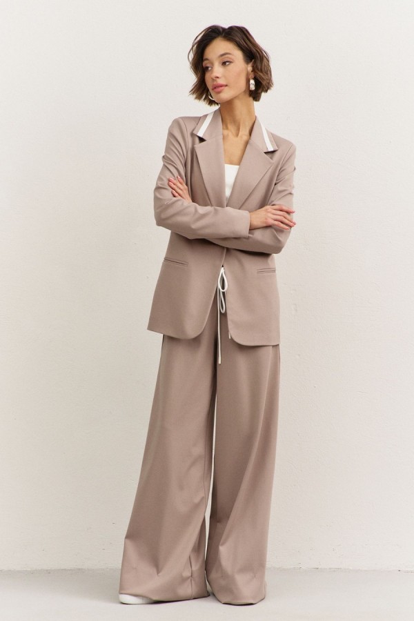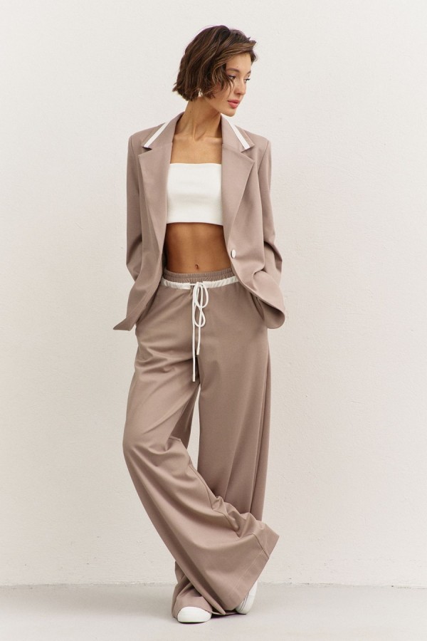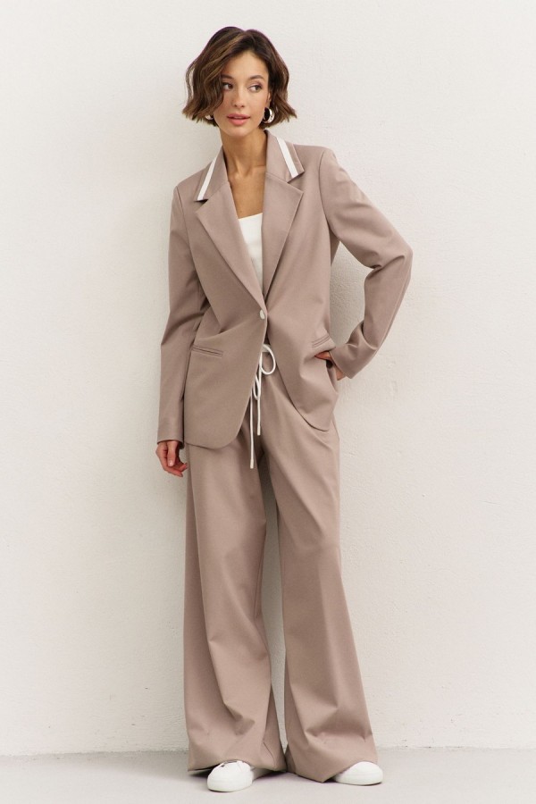 Костюм (жакет+брюки). Жакет полуприлегающего силуэта: • воротник пиджачного типа с лацканами, с декоративным элементом из отделочной ткани • застежка на пуговицу • прорезные карманы с рамкой • рукава втачные, длинные • на подкладке Брюки свободного кроя: • притачной пояс на резинке • по поясу кулиса из отделочной ткани и декоративный шнур • в боковых швах карманы