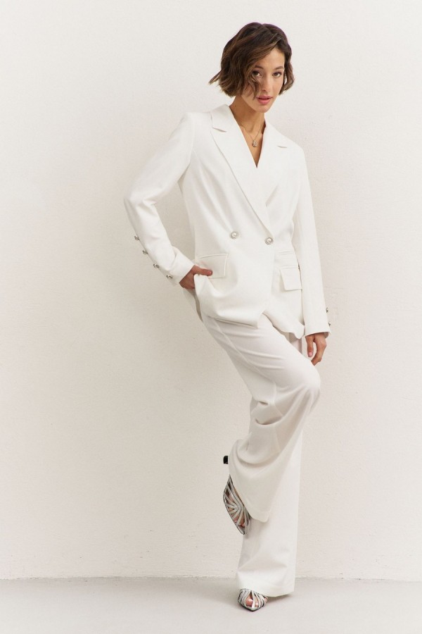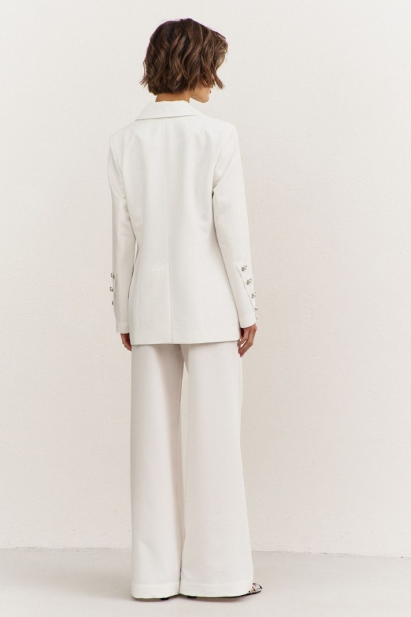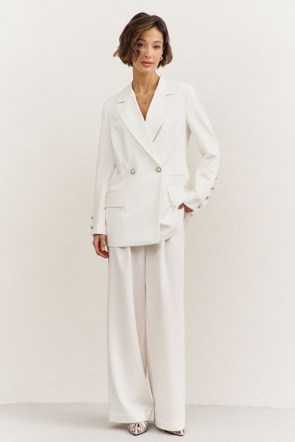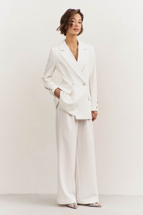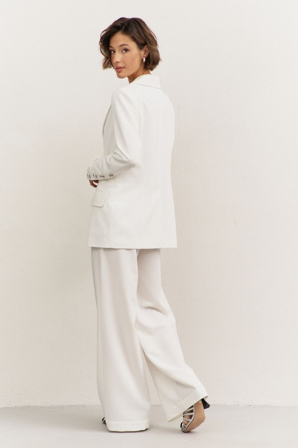 Костюм женский ( жакет и брюки) : -жакет полуприлегающего силуэта -рукава длинные, двушовные, втачные -локтевой шов с фигурной шлицей и декоративными пуговицами -воротник пиджачного типа -жакет на подкладке с плечевыми накладками -брюки длинные, широкие -застежка на пуговицу