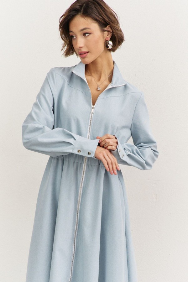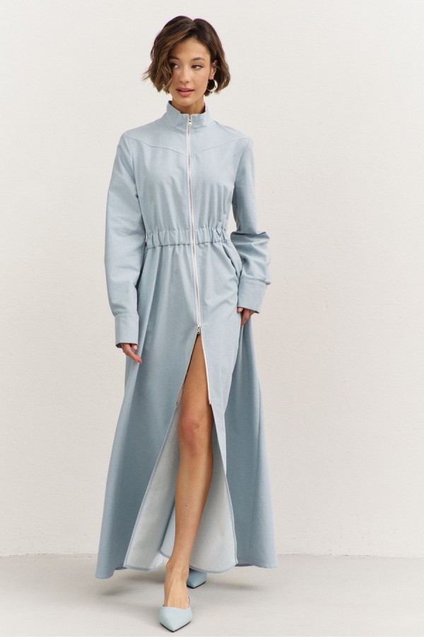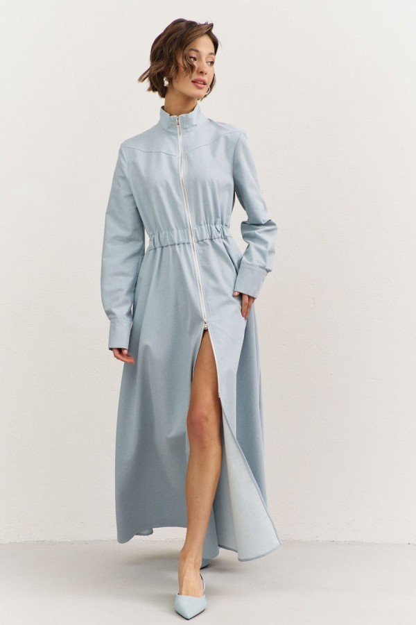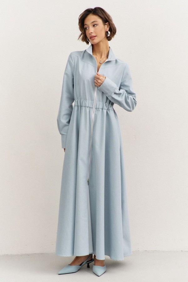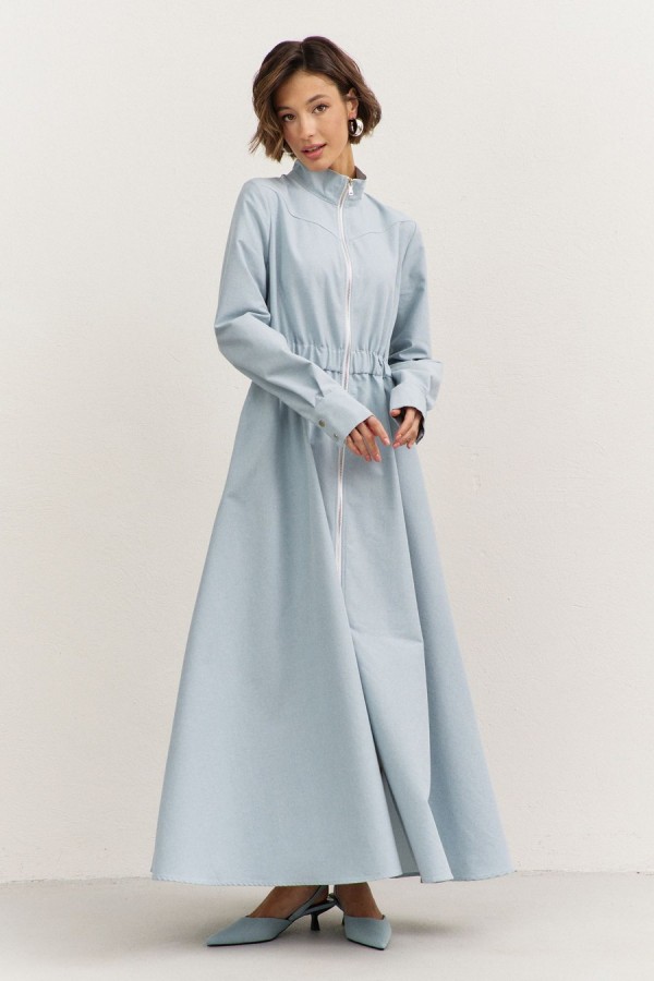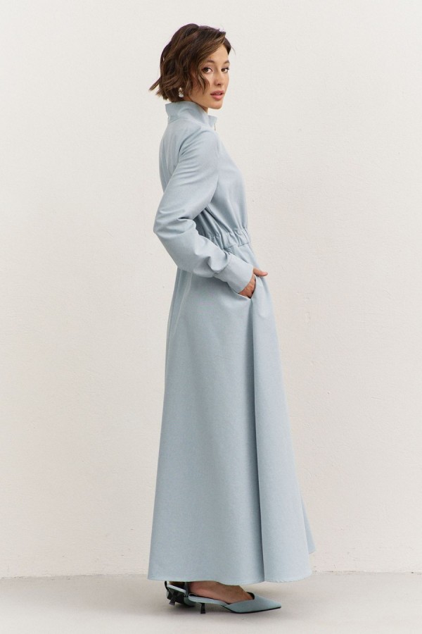 Платье полуприлегающего силуэта: • воротник-стойка • по переду кокетка • отрезное по линии талии • по талии кулиса с резинкой • юбка А-образного силуэта • застежка на молнию • в боковых швах карманы • рукава втачные, длинные с притачной манжетой • манжеты с застежкой на кнопки • длина макси