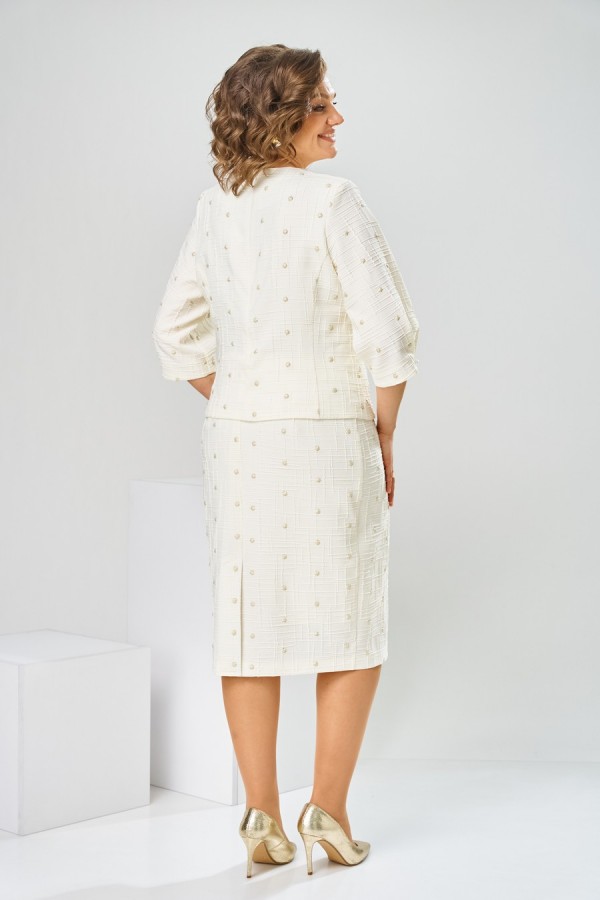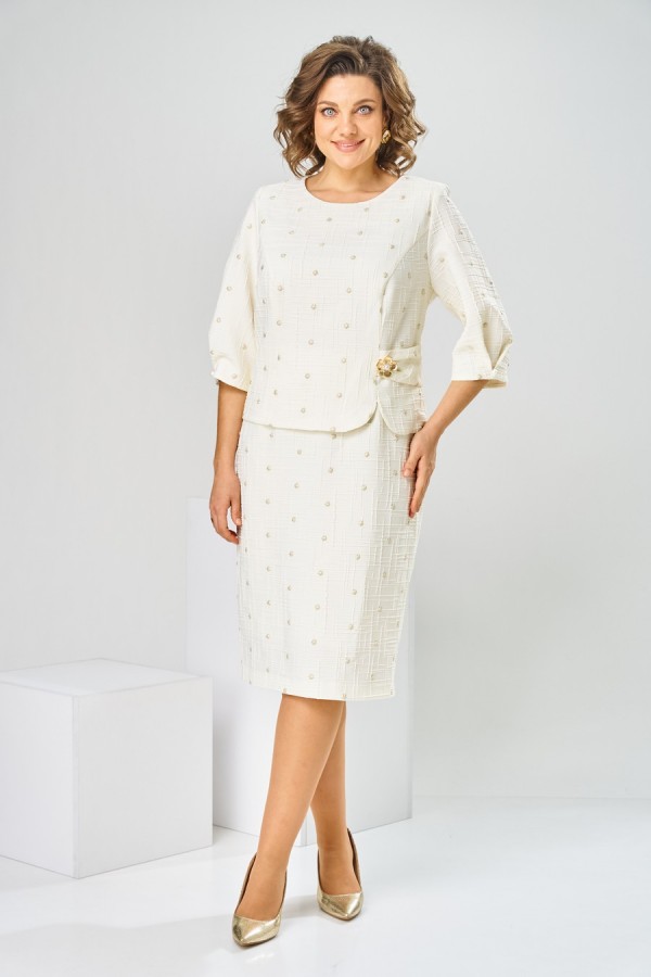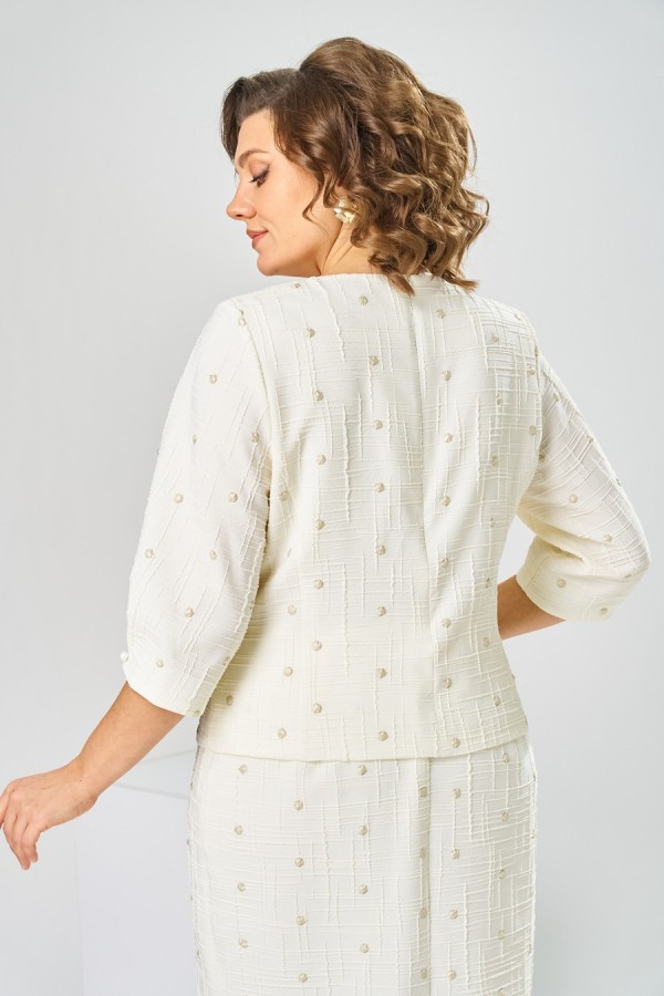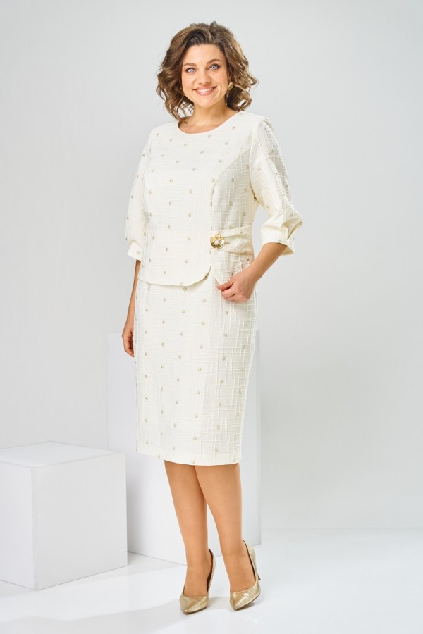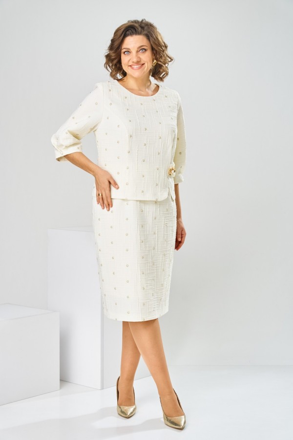 Платье женское, относится к нарядной торжественной одежде. Платье женское полу прилегающего силуэта, длиной за колено, выполнено в виде имитации костюма. Лиф платья отлетной. Перед с 2-мя отрезными бочками, левый бочок с отделочным фигурным поясом, декорированным объёмным украшением, шов притачивания левого бочка с разрезом с закруглёнными концами. Спинка лифа со средним швом и 2-мя отрезными бочками. Лиф платья на подкладке, к которой крепится нижняя часть платья (юбка). Переднее полотнище нижней части с 2-мя таллиевыми вытачками. Заднее полотнище с 2-мя таллиевыми вытачками и средним швом, заканчивающимся шлицей. Нижняя часть платья на подкладке. Горловина круглая, обтачная, без воротника. Застёжка на потайную тесьму-молнию в среднем шве спинки. Рукав втачной, одно шовный, длиной 3/4. Низ рукава со встречной складкой, обточной, складка декорирована пришивной пуговицей. Платье с плечевыми накладками. Длина спинки 104 см, длина рукава 42 см.