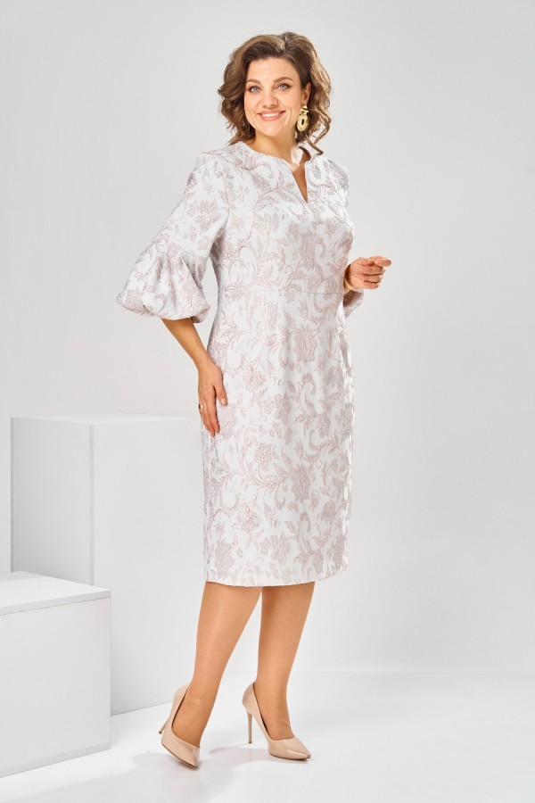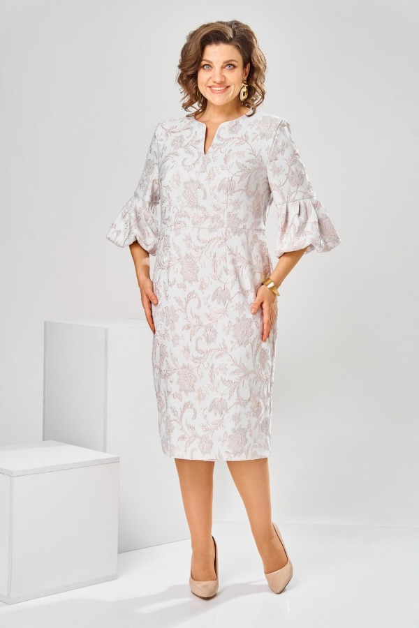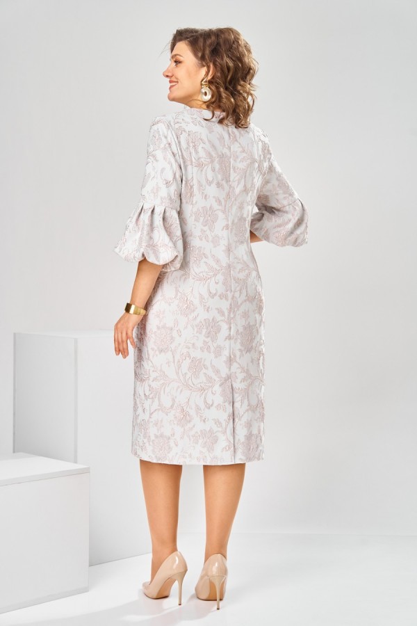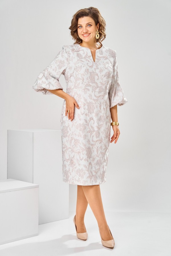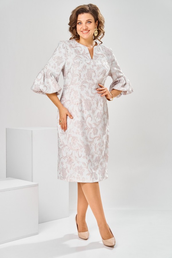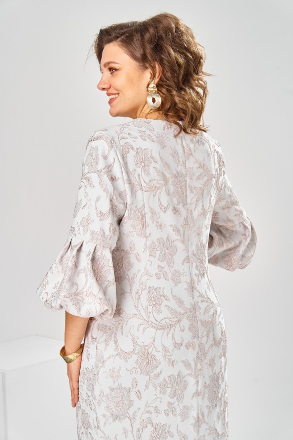 Платье женское, относится к торжественной нарядной одежде. Платье женское, полу прилегающего силуэта, длиной ниже колена. Перед отрезной по линии талии. Верхняя часть переда со средним швом и 2-мя таллиевыми вытачками, нижняя часть с 2-мя таллиевыми вытачками. Спинка с 2-мя таллиевыми вытачками и средним швом, заканчивающимся шлицей. Горловина фигурная, обточная, без воротника. Застёжка на потайную тесьму-молнию в среднем шве спинки. Рукав втачной, одно шовный, длиной 3/4, с горизонтальным разрезом, нижняя часть рукава с 5-ю односторонними складками, со сборкой по низу, низ обточной. Платье на подкладке с плечевыми накладками. Длина спинки платье 111 см, длина рукава 45 см.