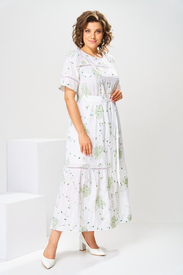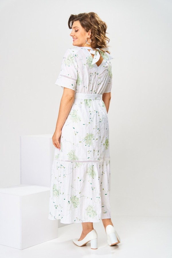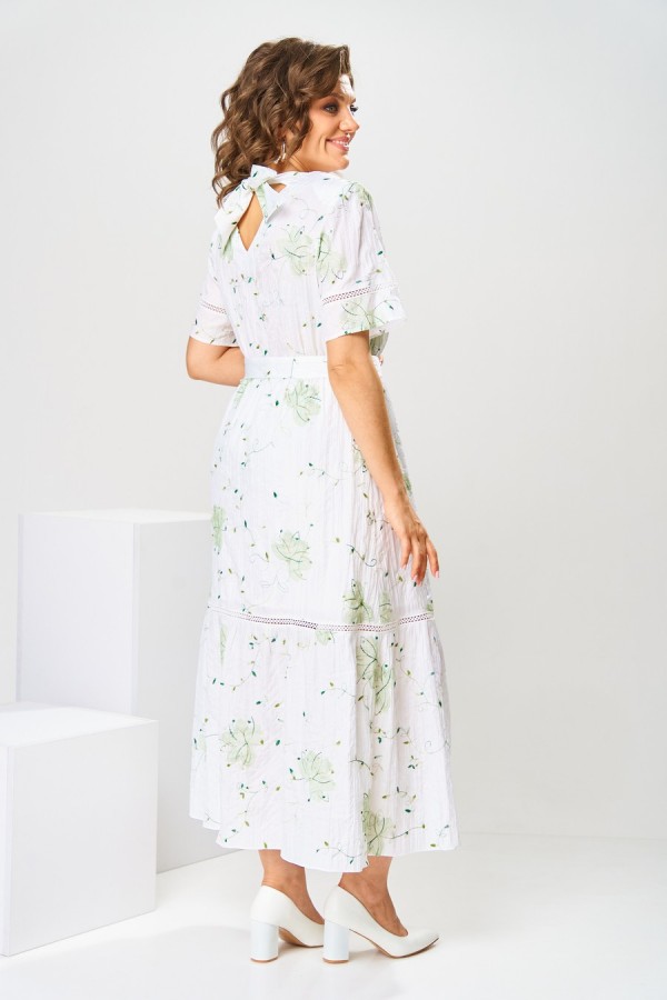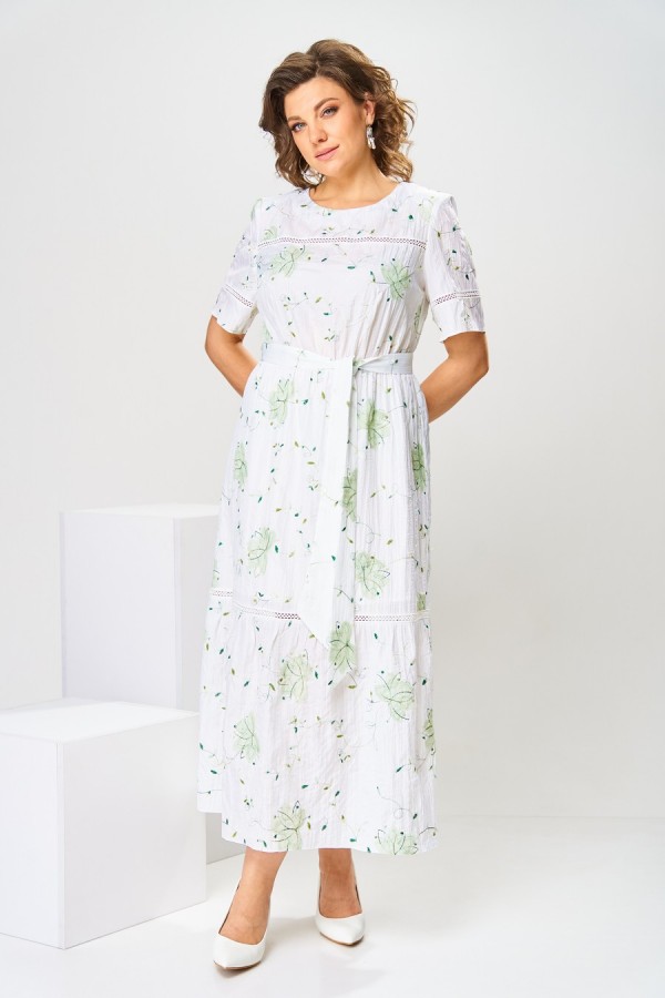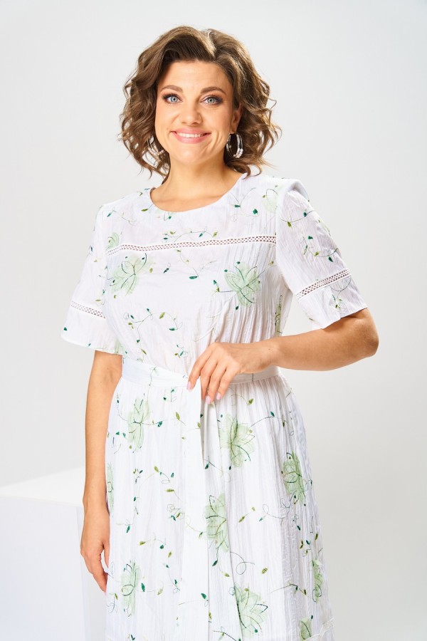 Платье женское, относится к нарядной торжественной одежде, но может использоваться и при повседневной носке. Платье женское, слегка расширенное к низу, длиной до нижней части икры. Перед с отрезной кокеткой, шов притачивания которой декорирован кружевом; с 2-мя нагрудными вытачками. Спинка цельнокроенная. Низ платья с притачным воланом, шов притачивания декорирован кружевом. Горловина круглая, обточная, без воротника, по спинке с v-образным вырезом, и 2-мя обтачными завязками. Рукав втачной, короткий одношовный с горизонтальным подрезом, декорированным кружевом. На уровне линии талии платье собрано на эластичную тесьму. Нижняя часть платья на подкладке. Платье с плечевыми накладками. К платью прилагается съёмный пояс. Длина спинки платья 115 см, длина рукава 27 см
