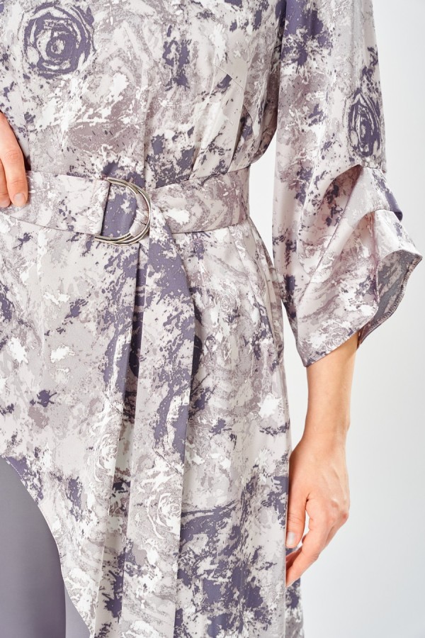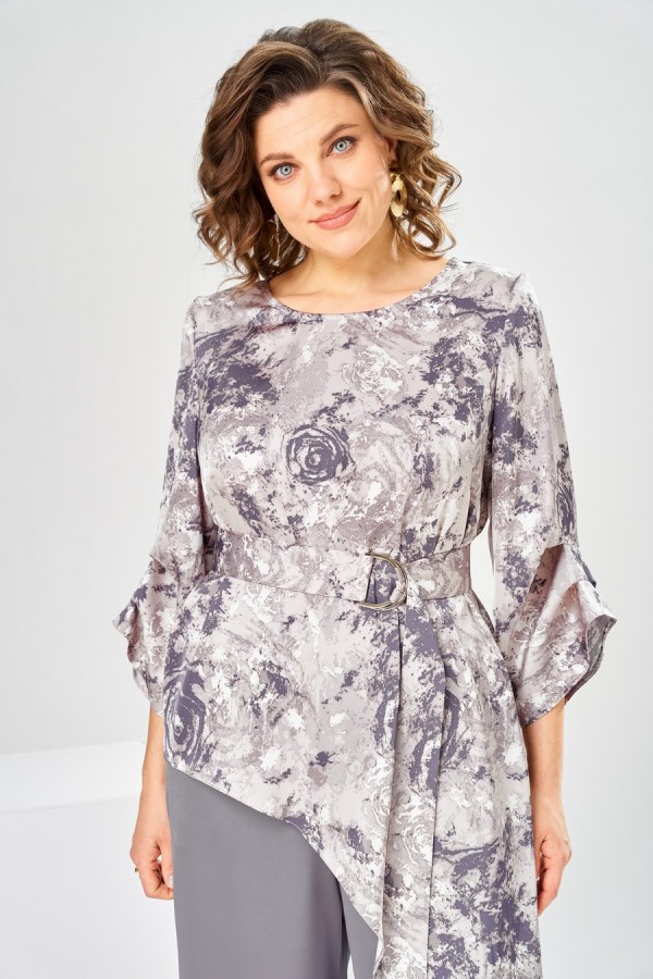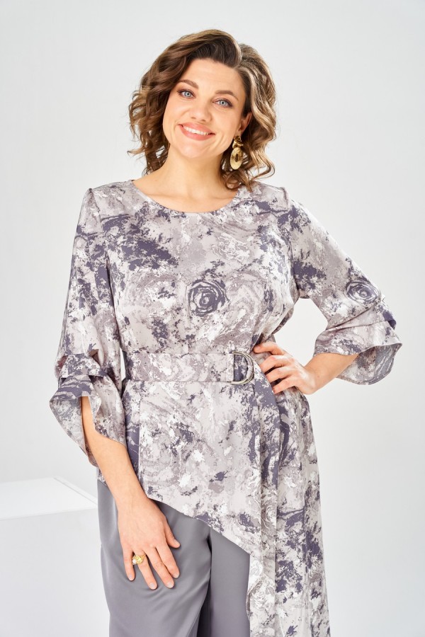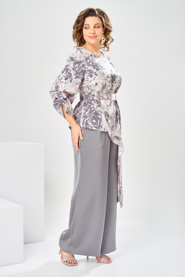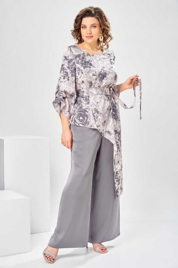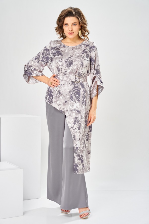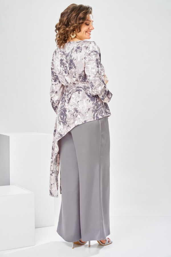 Костюм женский относится к торжественной одежде. Костюм женский 2-х предметный туника и брюки. Туника прямого силуэта, длиной до середины икры с ассиметричным подрезом переда и спинки. Перед с 2-мя нагрудными вытачками. Спинка цельнокроеная. Горловина круглая, обточная, без воротника. Рукав втачной, одно шовный, длиной 3/4, с 2-мя декоративными защипами, внизу шириной 3 см. Туника с плечевыми накладками. Брюки женские прямые длинные. Передние половинки с карманами в боковых швах. Задние половинки с таллиевыми вытачками. Брюки с притачным поясом, собранным на эластичную тесьму, закреплённую 2-мя отделочными строчками. К костюму прилагается съёмный пояс, фиксирующийся на металлическую пряжку. Длина брюк по боковому шву 105 см. Длина спинки туники 61 см, длина рукава 40,5 см.