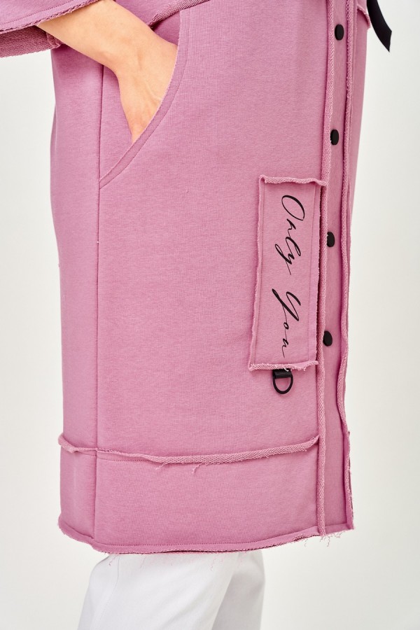 Кардиган женский прямого силуэта из трикотажной ткани (трехнитка-футер). На полочке и спинке расположены декоративные, необработанные швы. В верхней и нижней части переда есть настрочные элементы с печатью и тесьмой. По переду изделия карманы. Спинка со средним швом и кокеткой. На кокетке расположен элемент с печатью и тесьмой. Рукав спущенный с манжетой. Вырез горловины оформлен стойкой. По переду изделия планка с кнопками. Промеры на примере 52 размера: ОГ - 122 см (спущенное плечо), ОБ - 122 см. Длина изделия: 98 см ±1.0 Длина рукава от основания шеи: 59 см ±1.0 Состав: 90% хлопок, 10% эластан Рост: 164 см