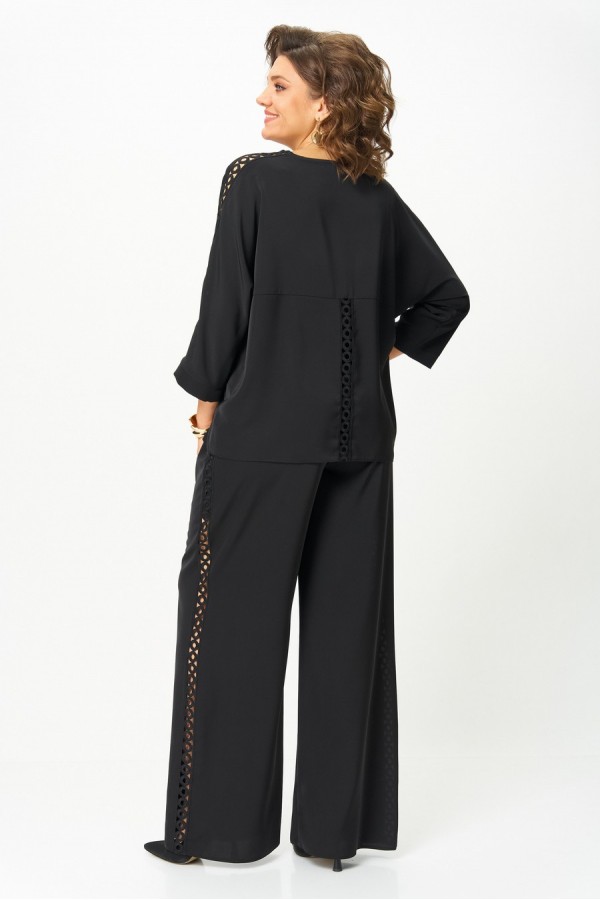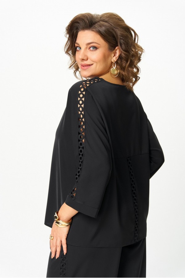 Элегантный женский костюм из легкой, струящейся ткани. Блуза женская из текстильной ткани. Прямого силуэта. По спинке расположен подрез. В шов вставлено кружево. Рукав 3/4, спущенный с манжетой. По плечевому шву вставлено кружево. Вырез лодочка. Обработан притачной бейкой. Промеры блузки на примере 52 размера: ОГ-120 см (спущенное плечо), ОБ-124 см (прямого силуэта). Длина изделия: по спинке 64 см. Длина рукава от крайней точки плеча 57 см. Брюки женские из текстильной ткани, прямого силуэта. По боковым швам вставлено кружево. Пояс брюк на резинке. Промеры брюк на примере 52 размера: ОБ-120см, ОТ (резинка в свободном состоянии) 82 см. Длина брюк по боковому шву с учетом пояса 109 см. Ширина брюк по низу меняется от размера ± 2 см. Состав костюма: 75% полиэстер, 20% вискоза, 5% эластан. Рост 170 см.