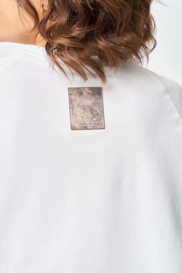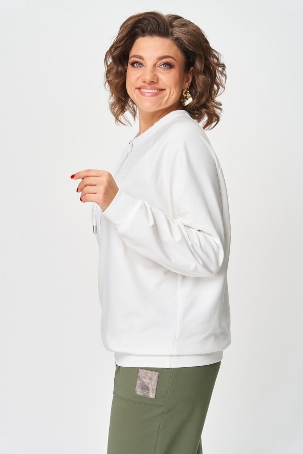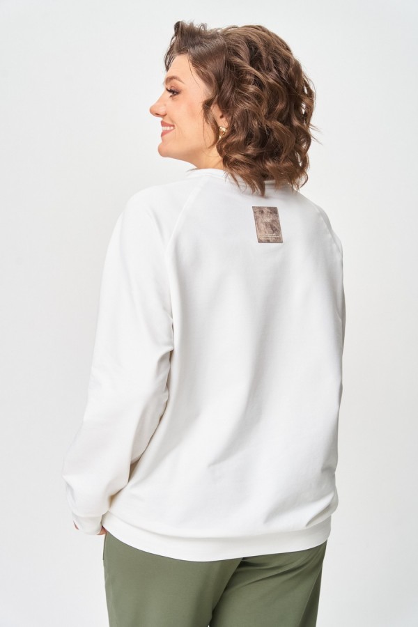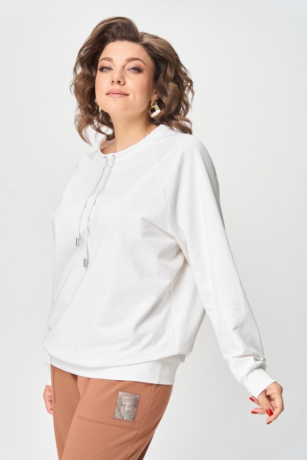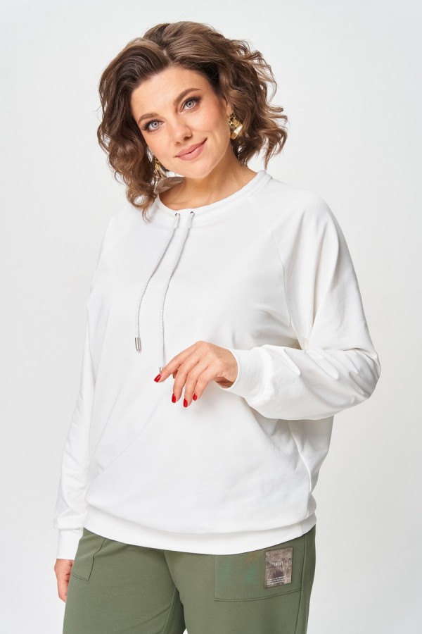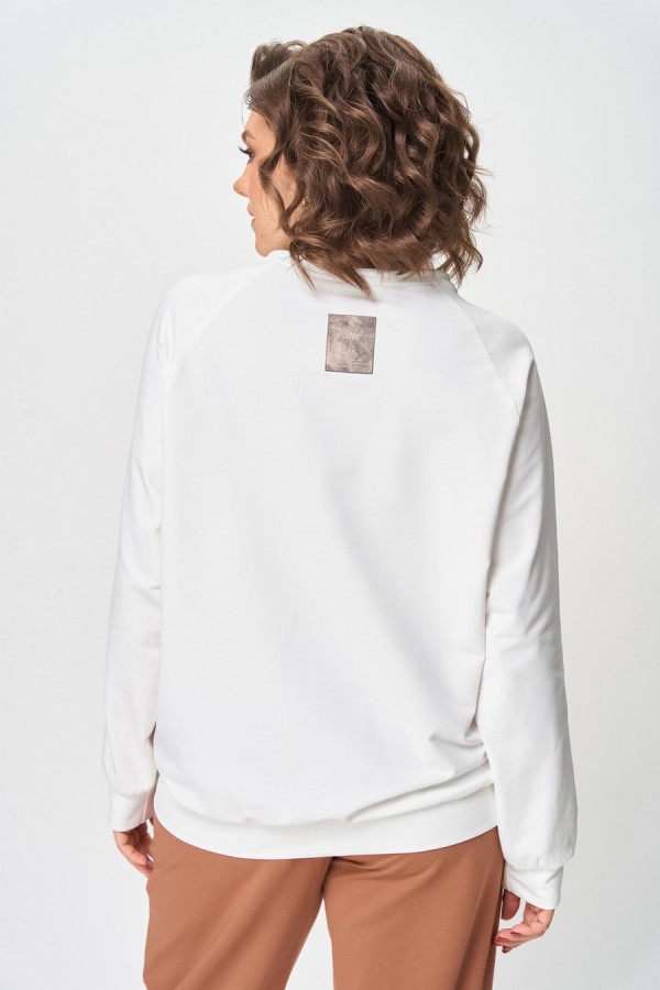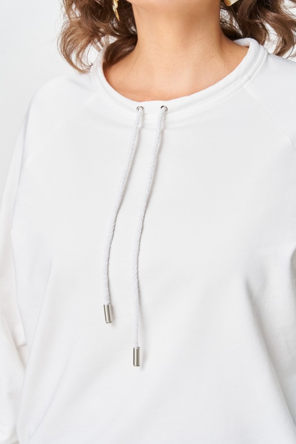 Джемпер женский из трикотажной хлопковой ткани (двунитка). Рукав реглан. Низ рукава обработан притачной манжетой. Низ изделия оформлен притачным поясом. На спинке настрочен декоративный элемент. Вырез горловины круглый, обработан бейкой со шнуром.