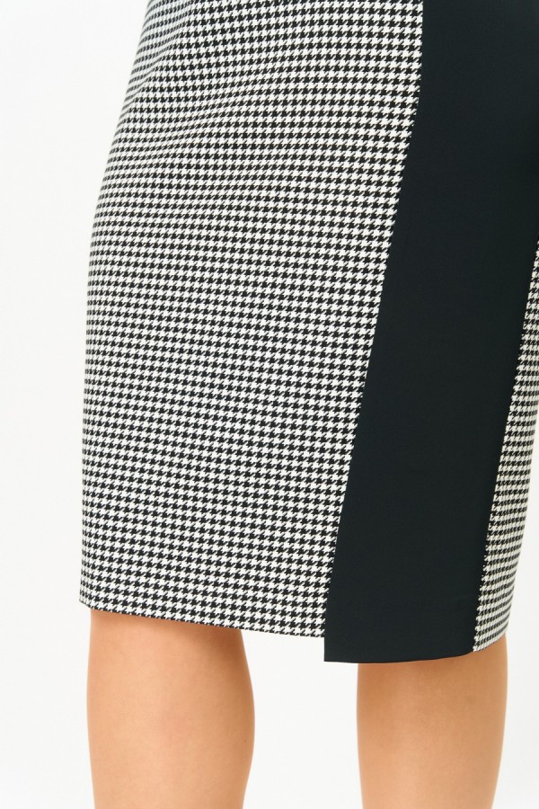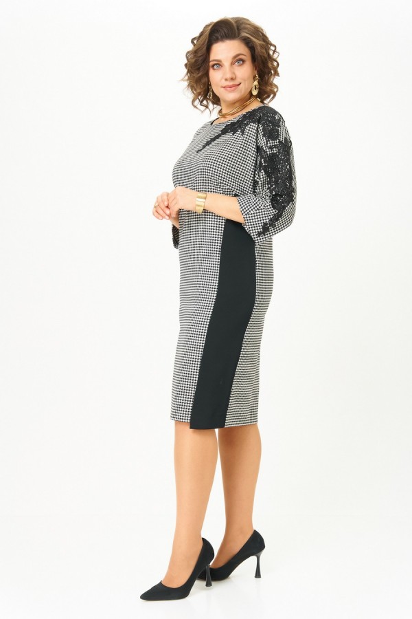 Платье женское, полуприлегающего силуэта из текстильной ткани. Перед платья с нагрудными выточками и отрезным бочком из отделочной ткани. Спинка со средним швом и шлицей. Рукав цельнокроеный. Вырез горловины круглый. На плечевом шве расположена аппликация. Промеры на примере 52 размера: Обхват груди - 104 см (цельнокроенный рукав), обхват бедёр 110 см. Длина изделия: 102 см. Длина рукава от крайней точки шеи: 56 см Состав ткани: 80% полиэстер, 18% вискоза, 2% эластан Рост: 164 см