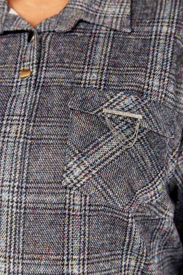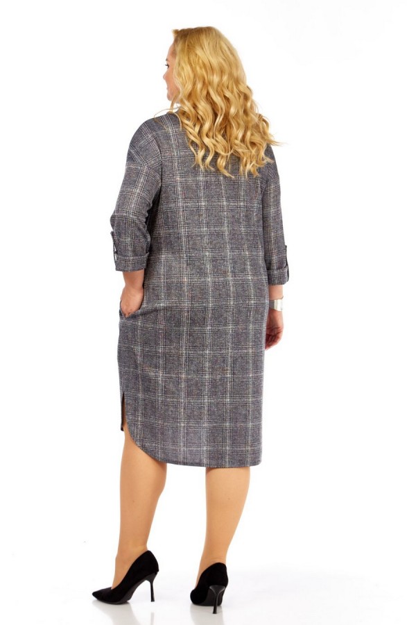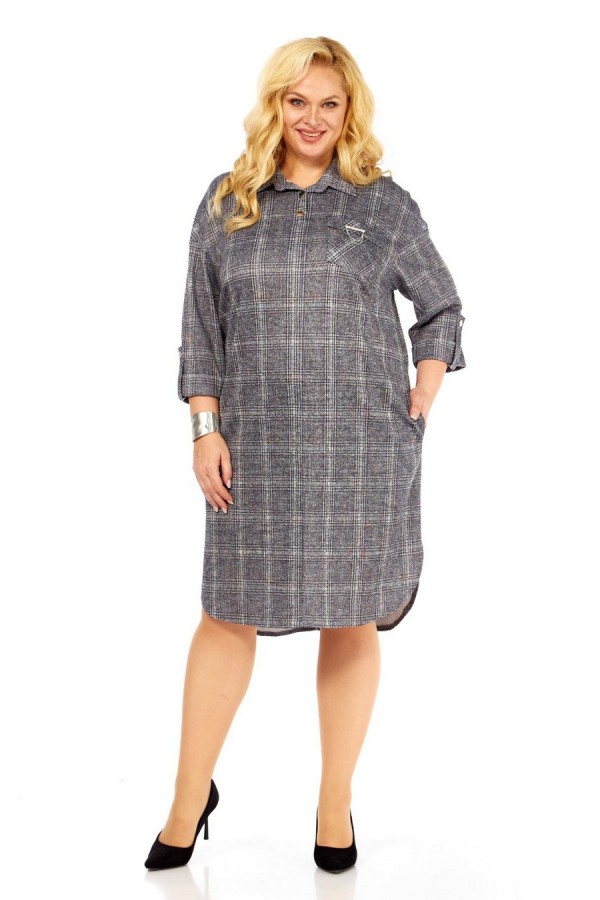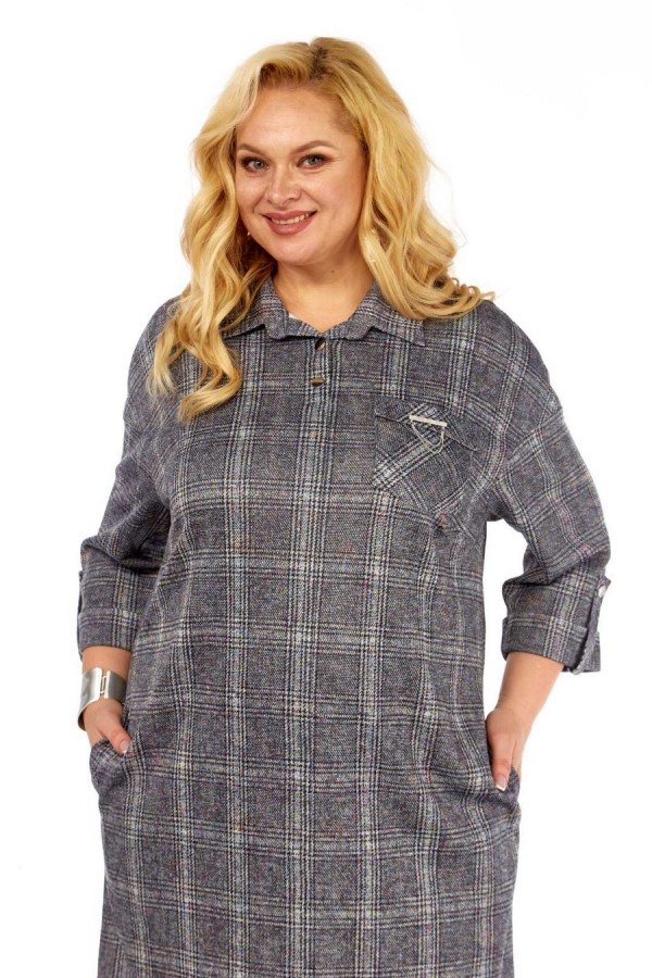 62 р – ПОГ 66 ПОТ 64 ПОБ 69 Силуэт полуприлегающий. Рукав со спущенной линией плеча. Внизу рукава выполнены отвороты, закреплённые патой с застёжкой на пуговицу. Длина рукава от горловины 60 см. Воротник рубашечного типа, на стойке. Перед со средним швом и нагрудными вытачками. Вверху по среднему шву выполнена планка с застёжкой на две пуговицы. Вверху левой полочки настрочен накладной карман с отворотом, дополнительно украшенный декоративным элементом. В боковых швах платья на уровне бёдер выполнены потайные карманы. Внизу боковых швов платье с закруглёнными разрезами. Длина платья по спинке 106см. Платье выполнено из трикотажного полотна.