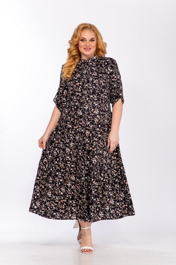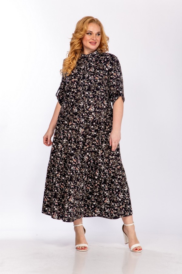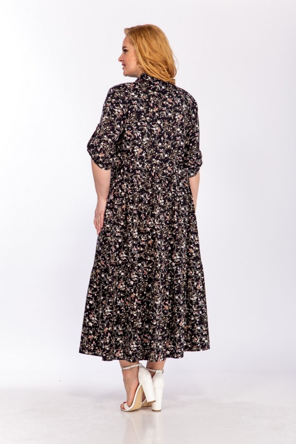 В 54 размере ПОГ 58 ПОТ 57 ПОБ 76. Длина по спинке 128 Длина рукава 40 см. Силуэт полуприлегающий. Рукав втачной, одношовный. Низ рукава драпируется патой с застёжкой на пуговицу. Длина рукава 40 см. Воротник – стойка. По линии талии платье отрезное. Верх переда с нагрудными вытачками и застёжкой на петли и пуговицы. Низ платья состоит из двух ярусов оборок, по которым выполнена сборка. Платье выполнено из штапеля Состав: вискоза 100 %