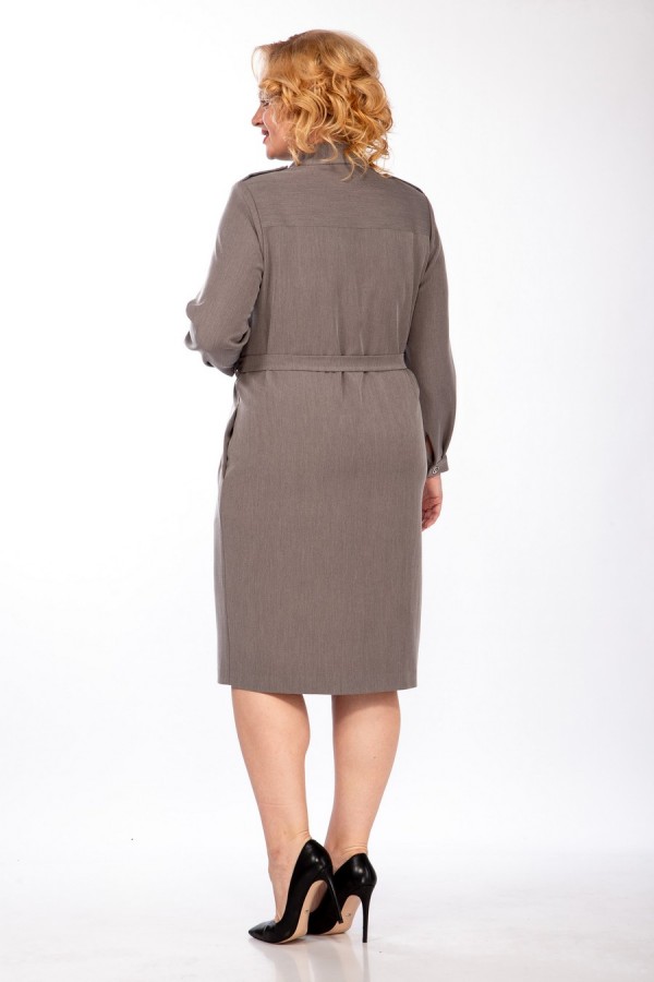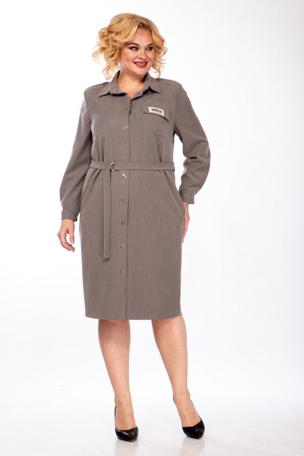 Силуэт полуприлегающий. Рукав втачной, одношовный. Низ рукава со складками и на манжете с застёжкой на пуговицу. Длина рукава 58 см. Горловина с отложным воротником на стойке, рубашечного типа. Перед с застёжкой до низа на пуговицы. Полочки с кокетками и нагрудными вытачками. В верхней части левой полочки расположен клапан, дополнительно украшенный декоративным элементом. Спинка с кокеткой. На уровне бёдер в боковых швах выполнены потайные карманы. В комплекте к платью идёт пояс с застёжкой на пряжку. Конец пояса украшен металлическим зажимом. Длина платья по спинке 106 см. 60 р. – ПОГ 65, ПОБ 67