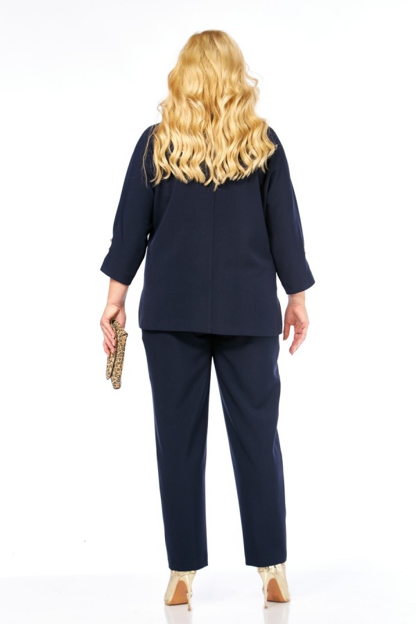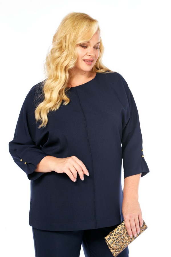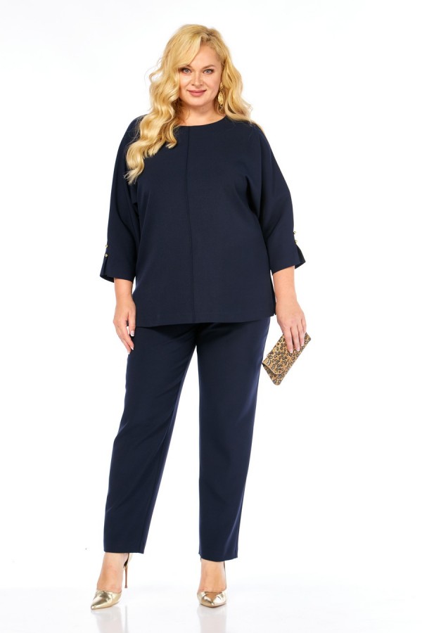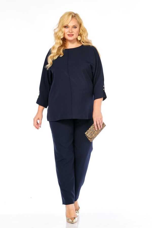 Силуэт полуприлегающий. Рукав цельнокроеный, «летучая мышь». Внизу по центру рукава закреплена встречная складка, дополнительно украшенная пуговицами. Длина рукава от горловины 55см. Горловина закруглённая, на обтачке. По центру переда застрочен защип (стрелка). Спинка со средним швом. Внизу боковых швов выполнены разрезы. Длина блузки по спинке 69см. Брюки прилегающие, спереди на молнии. Посадка стандартная. Пояс с резинкой по бокам. Длина брюк по боковому шву (без учёта пояса) 104 см. Комплект выполнен из костюмно-плательной ткани. Состав: пэ 65% спандекс 4% вискоза 31 %